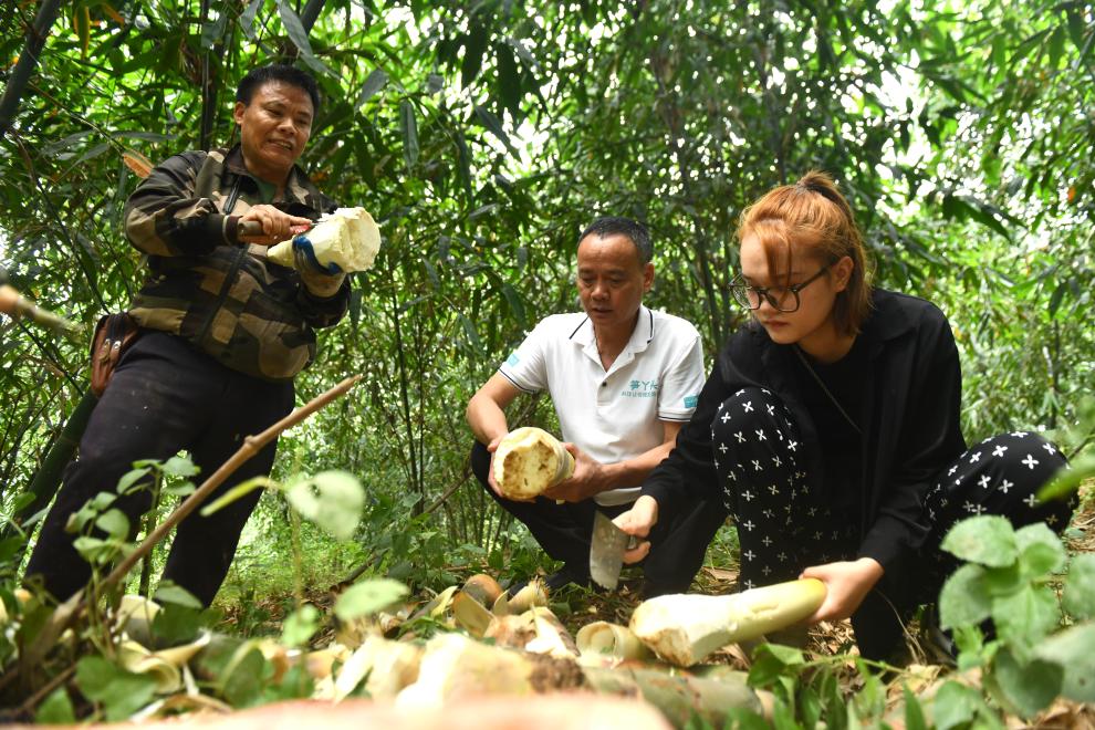 颜茜茜(右)和父亲颜建条(中)在竹笋种植基地采收竹笋(2024年7月23日摄)。29岁的颜茜茜是广西柳州市柳江区三都镇白见村的