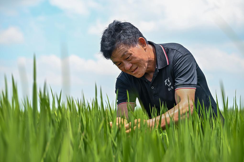 安徽凤阳小岗村种粮大户程夕兵在田里观察水稻长势(2024年7月25日摄)。新华社记者 李鑫 摄