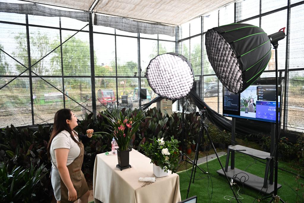 带货主播在江苏省宿迁市宿豫区陆集街道一处绿植销售基地推介销售绿植(2024年6月11日摄)。新华社记者 季春鹏 摄