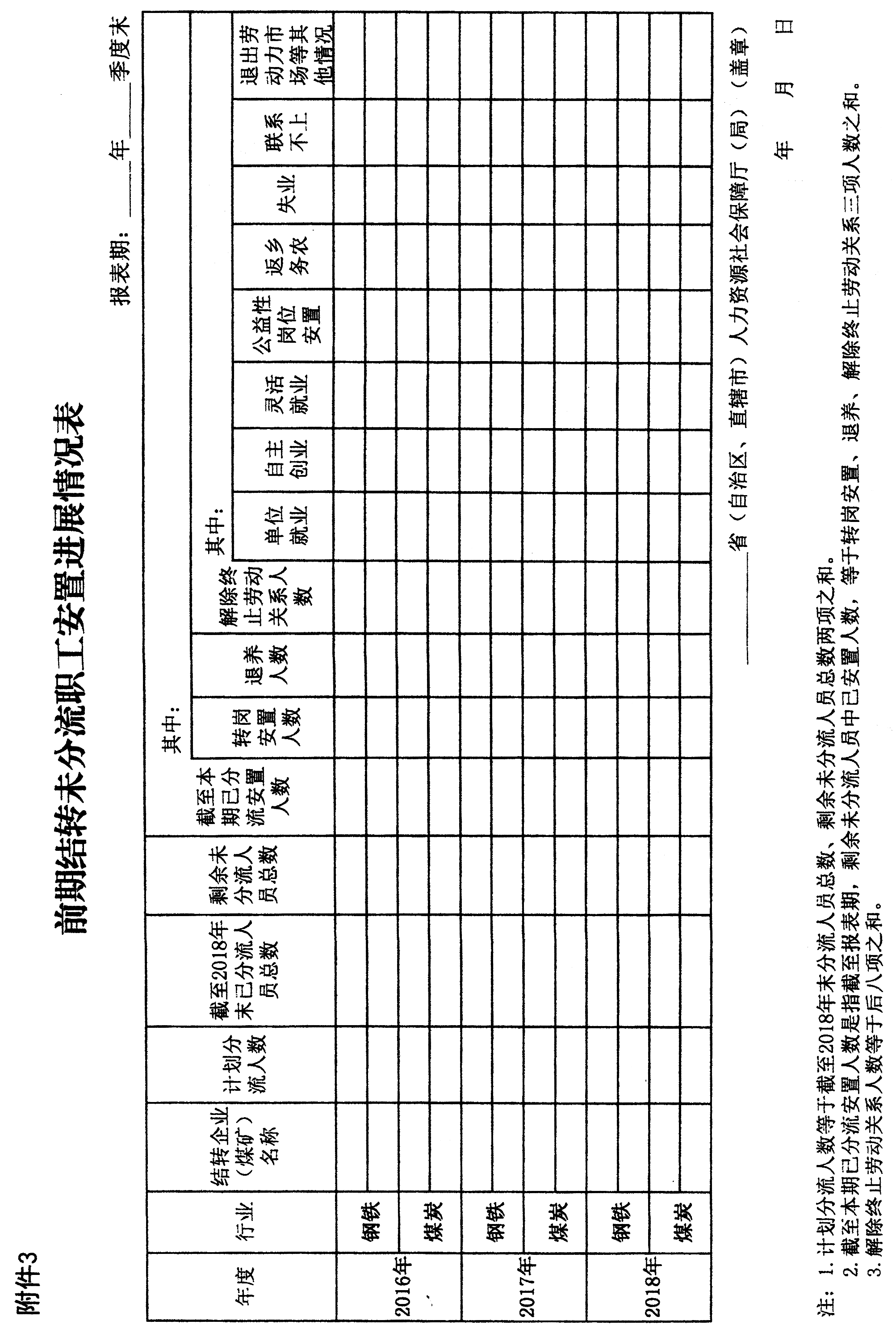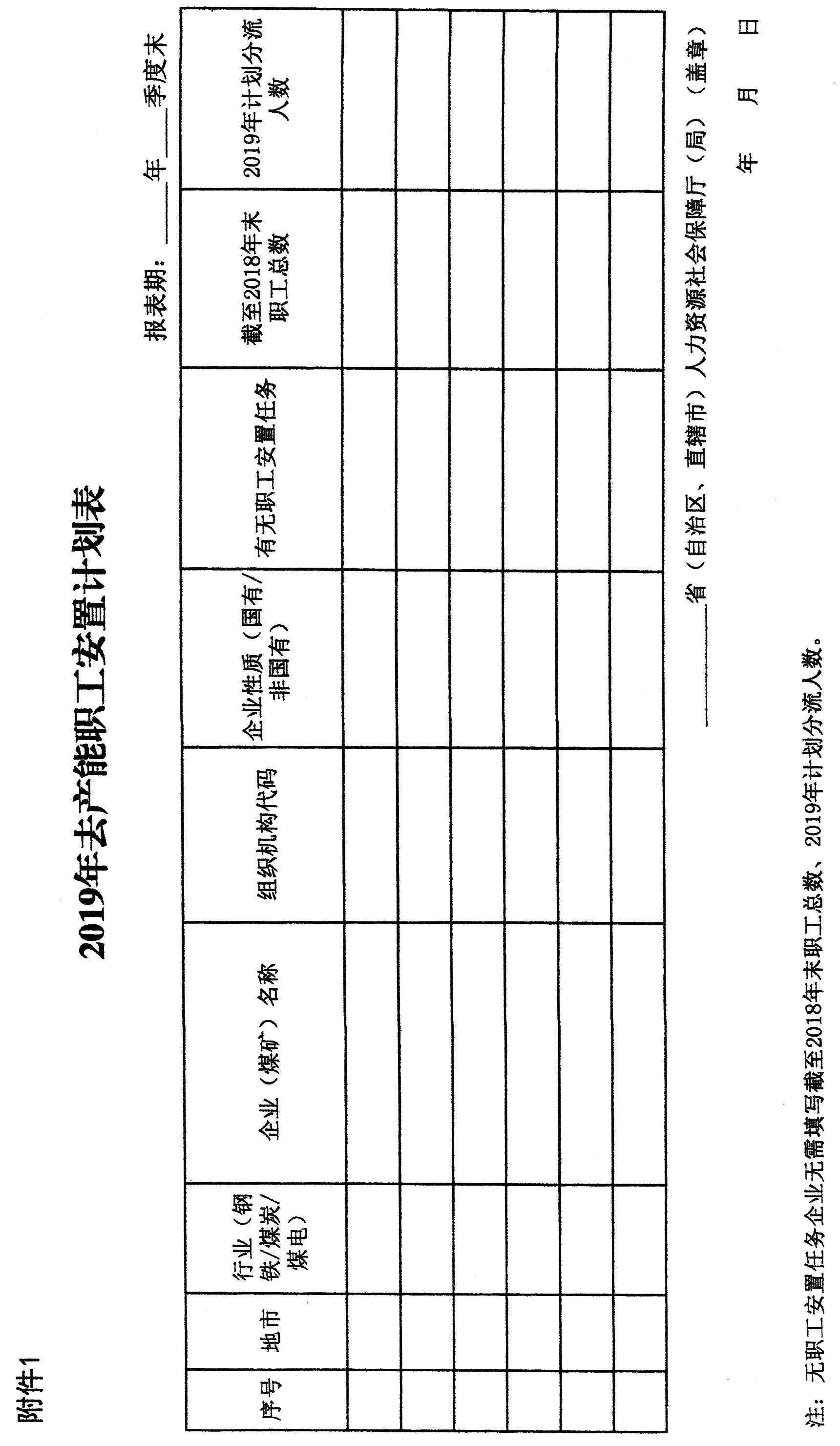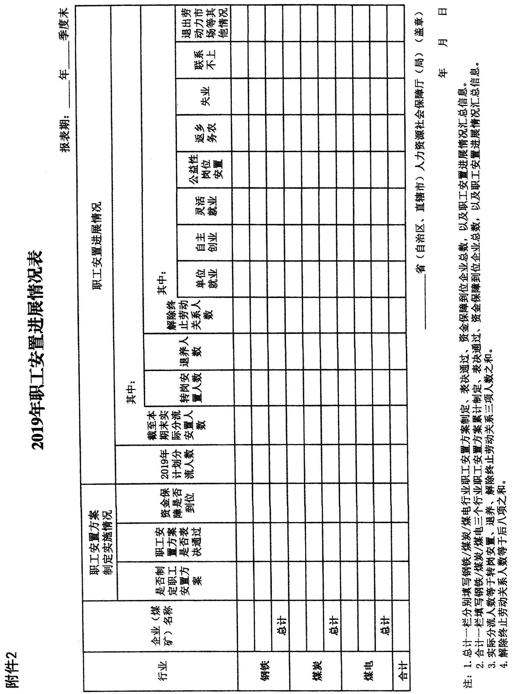 各地要切实提高思想认识,坚持把职工安置作为化解过剩产能工作的重中之重,加强组织领导,落实工作责任,稳妥推进职工分流安置,切实保障职工合法权益。同时,为掌握职工分流安置进展情况,请各地人力资源社会保障部门认真填报2019年去产能职工安置计划表(附件1)、2019年职工安置进展情况表(附件2)、前期结转未分流职工安置进展情况表(附件3,仅吉林、山西、山东、陕西4省填报),第一次报送时间为7月19日,之后每季度初前5个工作日内上报。