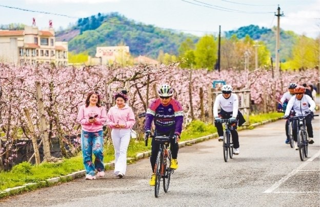 图为游客和骑行爱好者在桃花盛开的河口景区畅游。