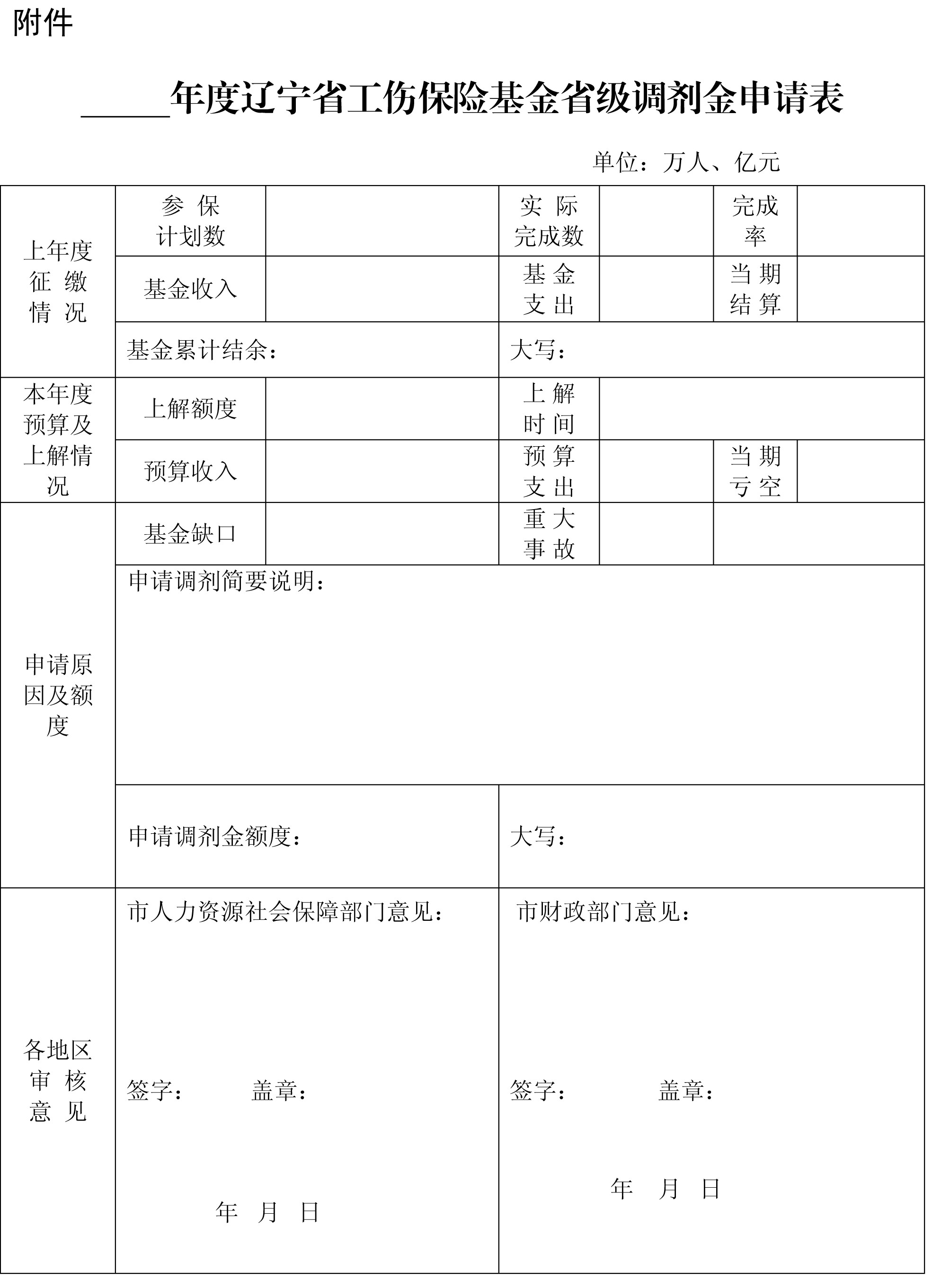 第十二条 申请材料中应包括以下内容:基金收支和累计结余情况;年度预算执行情况、参保扩面任务完成情况、出现缺口原因分析和解决措施、工伤保险政策落实情况;重大事故情况报告及处理情况等,填写《年度辽宁省工伤保险基金省级调剂金申请表》(见附件),同时提交省级调剂金使用方案。