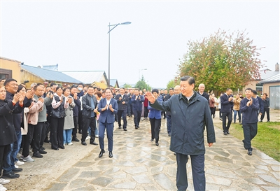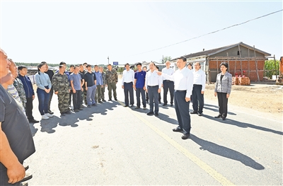 9月6日至8日,中共中央总书记、国家主席、中央军委主席习近平在黑龙江考察。这是7日上午,习近平在遭受洪涝灾害的哈尔滨尚志市老街基乡龙王庙村,同当地村民和施工人员亲切交流。