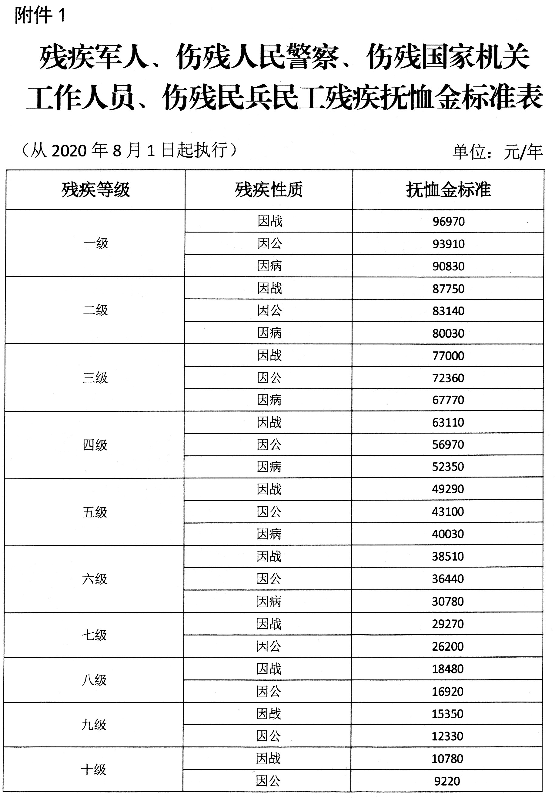 附件:1.残疾军人、伤残人民警察、伤残国家机关工作人员、伤残民兵民工残疾抚恤金标准表