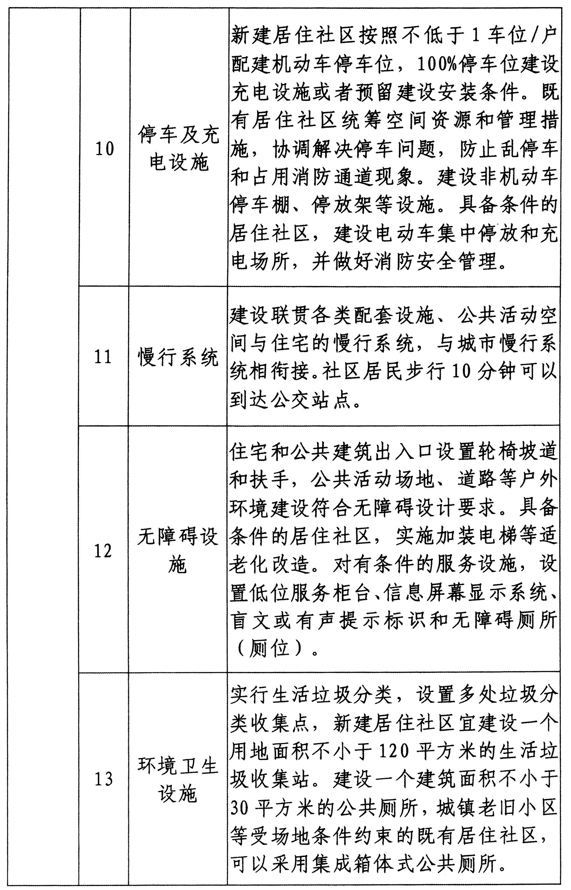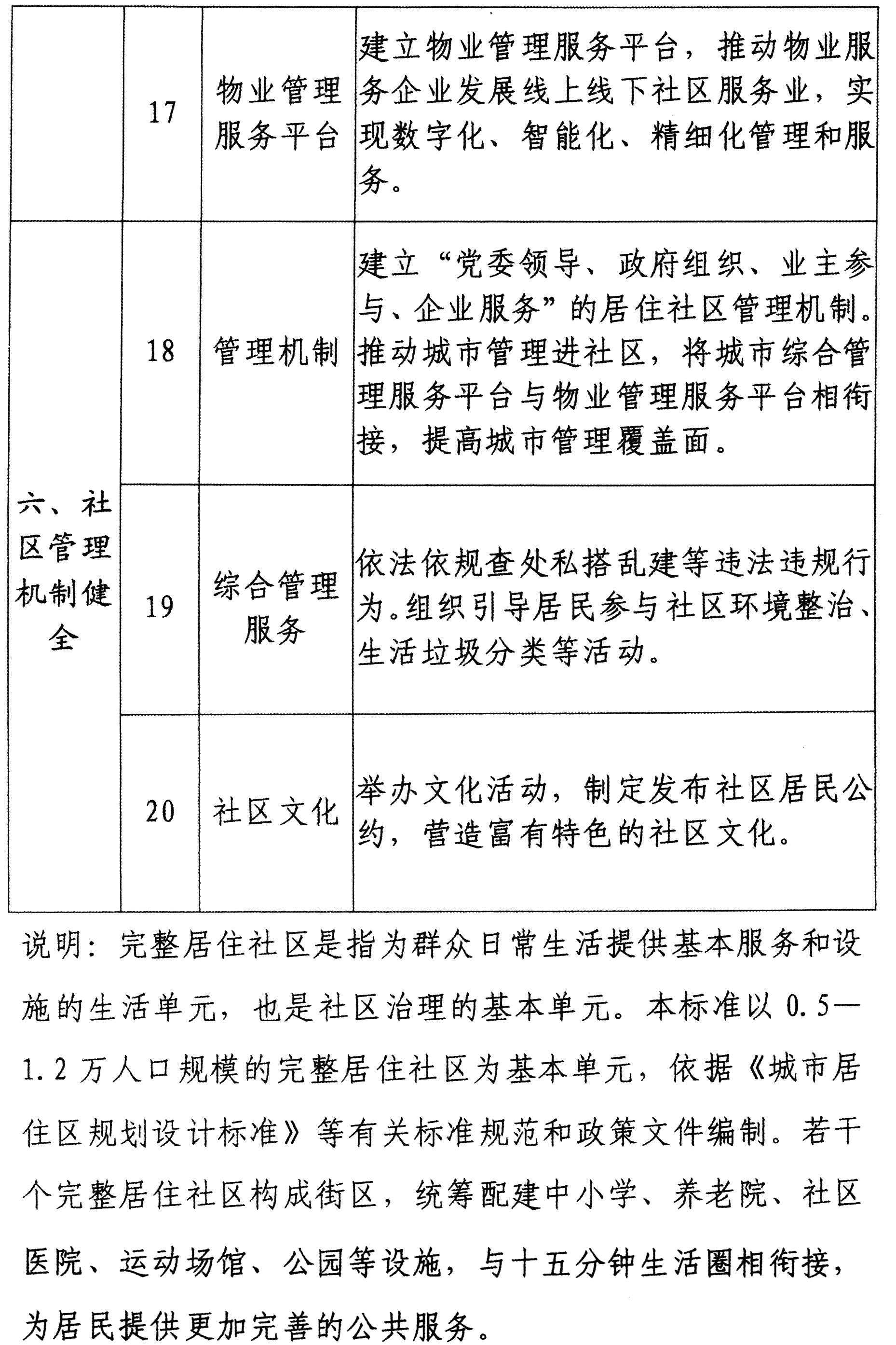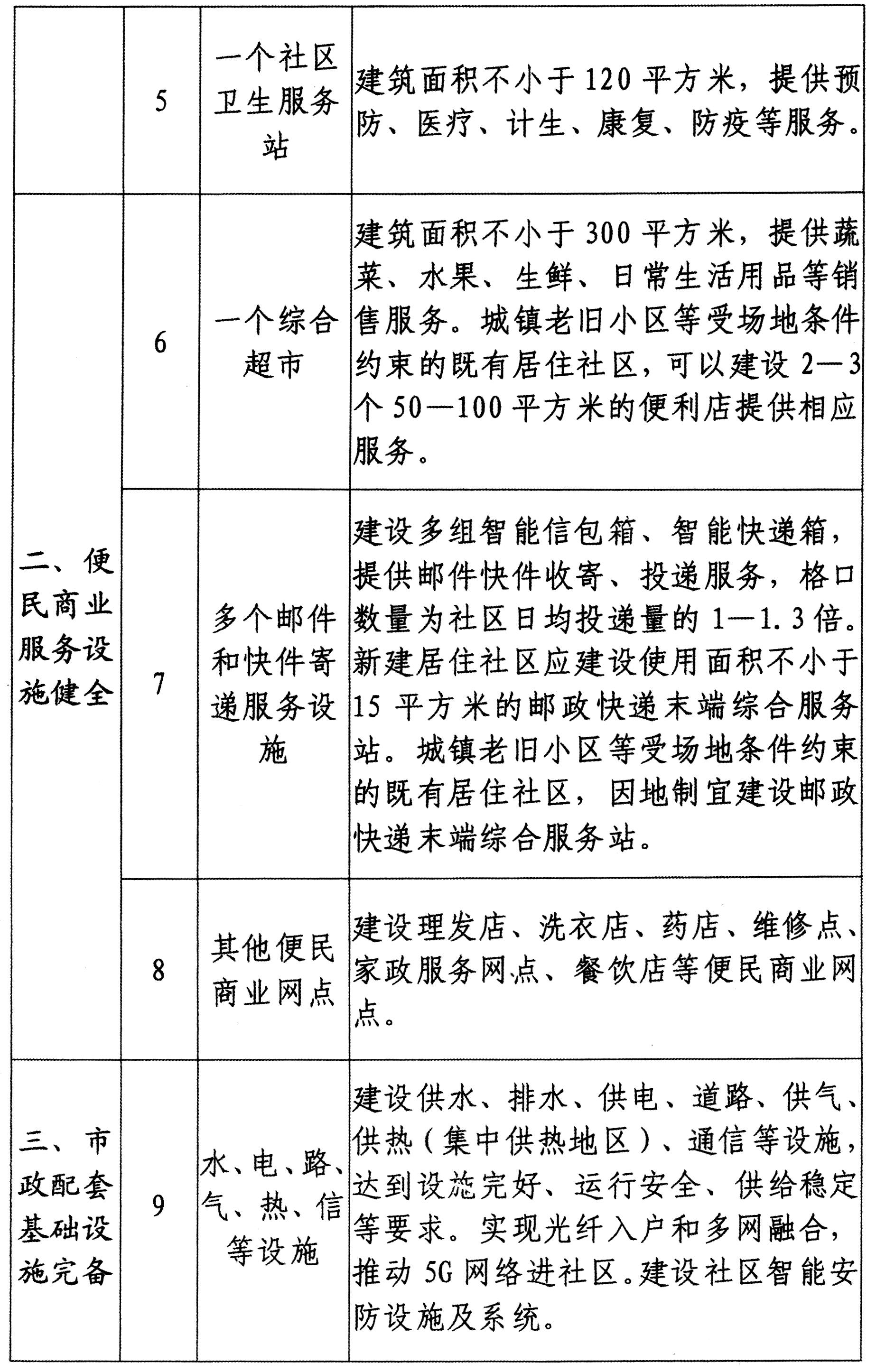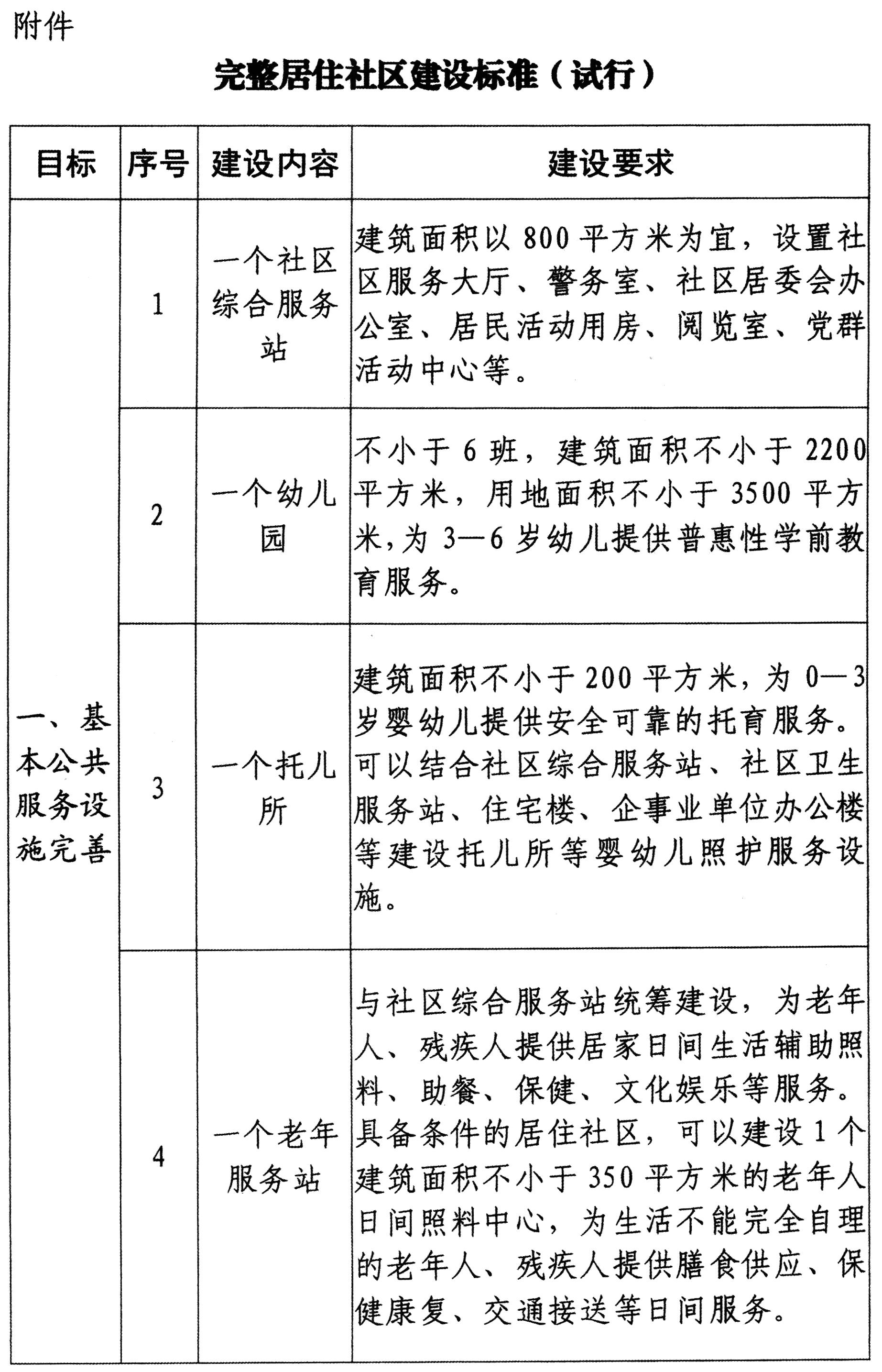 (二)落实完整居住社区建设标准。按照《完整居住社区建设标准(试行)》(附件),结合地方实际,细化完善居住社区基本公共服务设施、便民商业服务设施、市政配套基础设施和公共活动空间建设内容和形式,作为开展居住社区建设补短板行动的主要依据。