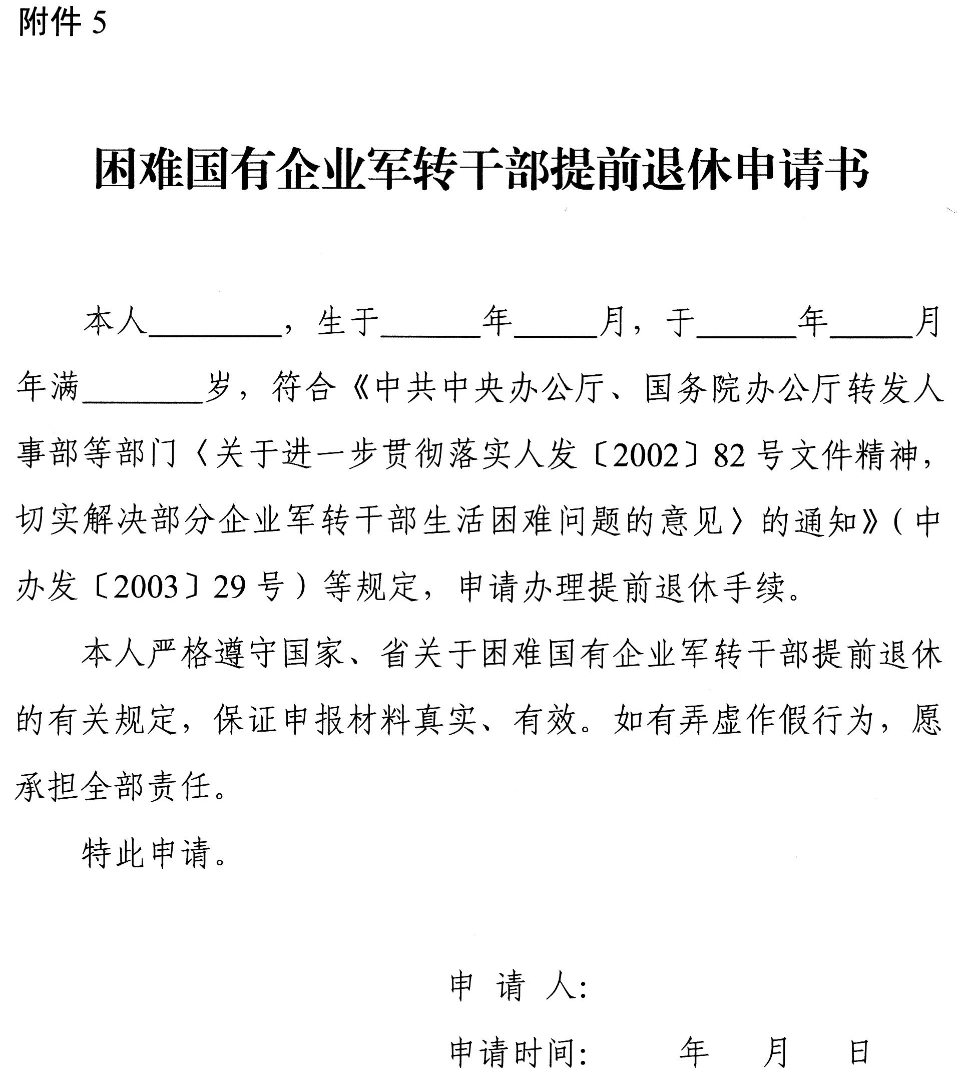 困难国有企业军转干部申请提前退休,申报材料除正常退休情况下应提供的材料外,还需提供《困难国有企业军转干部提前退休申请书》、困难国有企业证明材料。