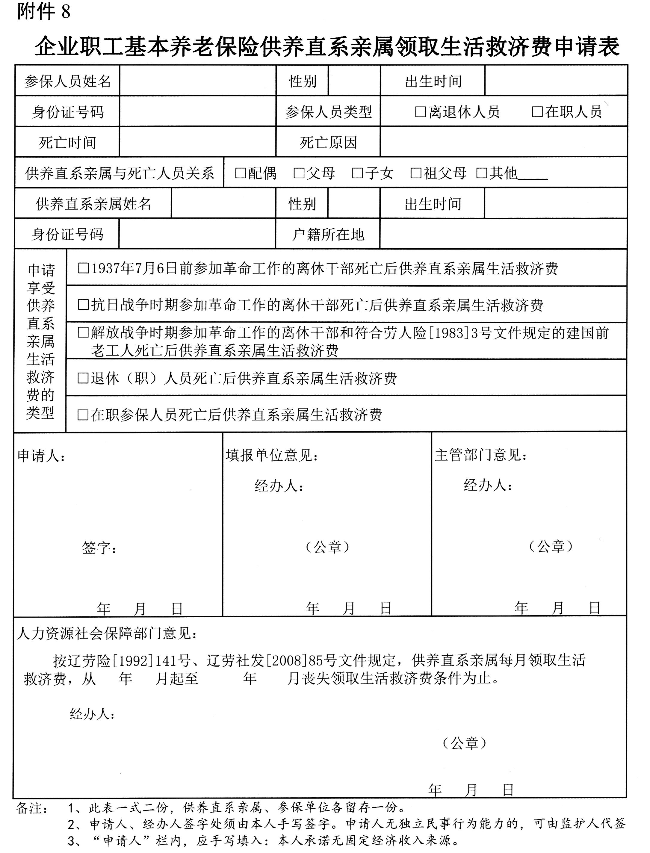 8.企业职工基本养老保险供养直系亲属领取生活救济费申请表