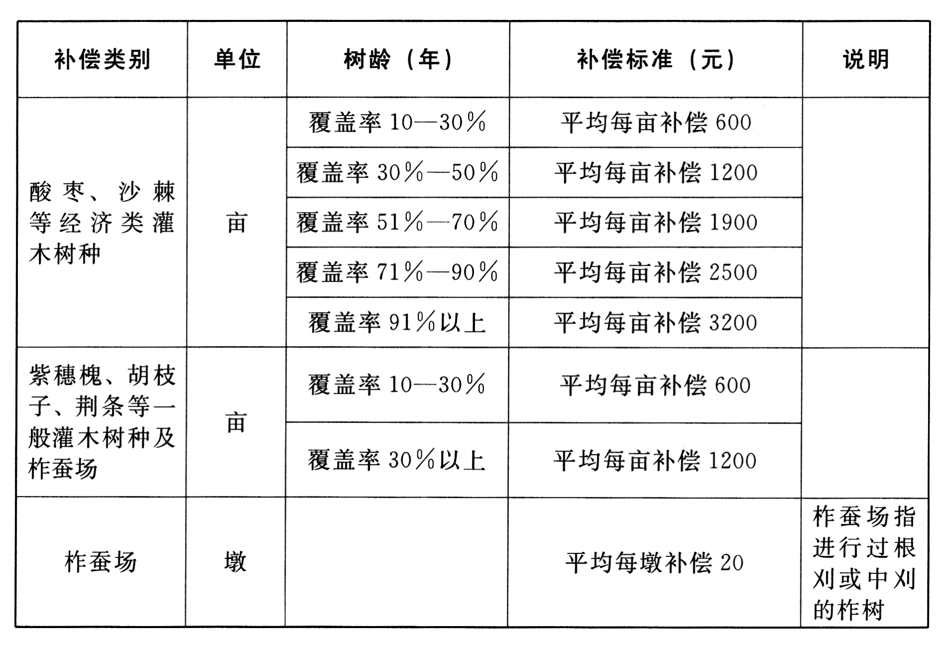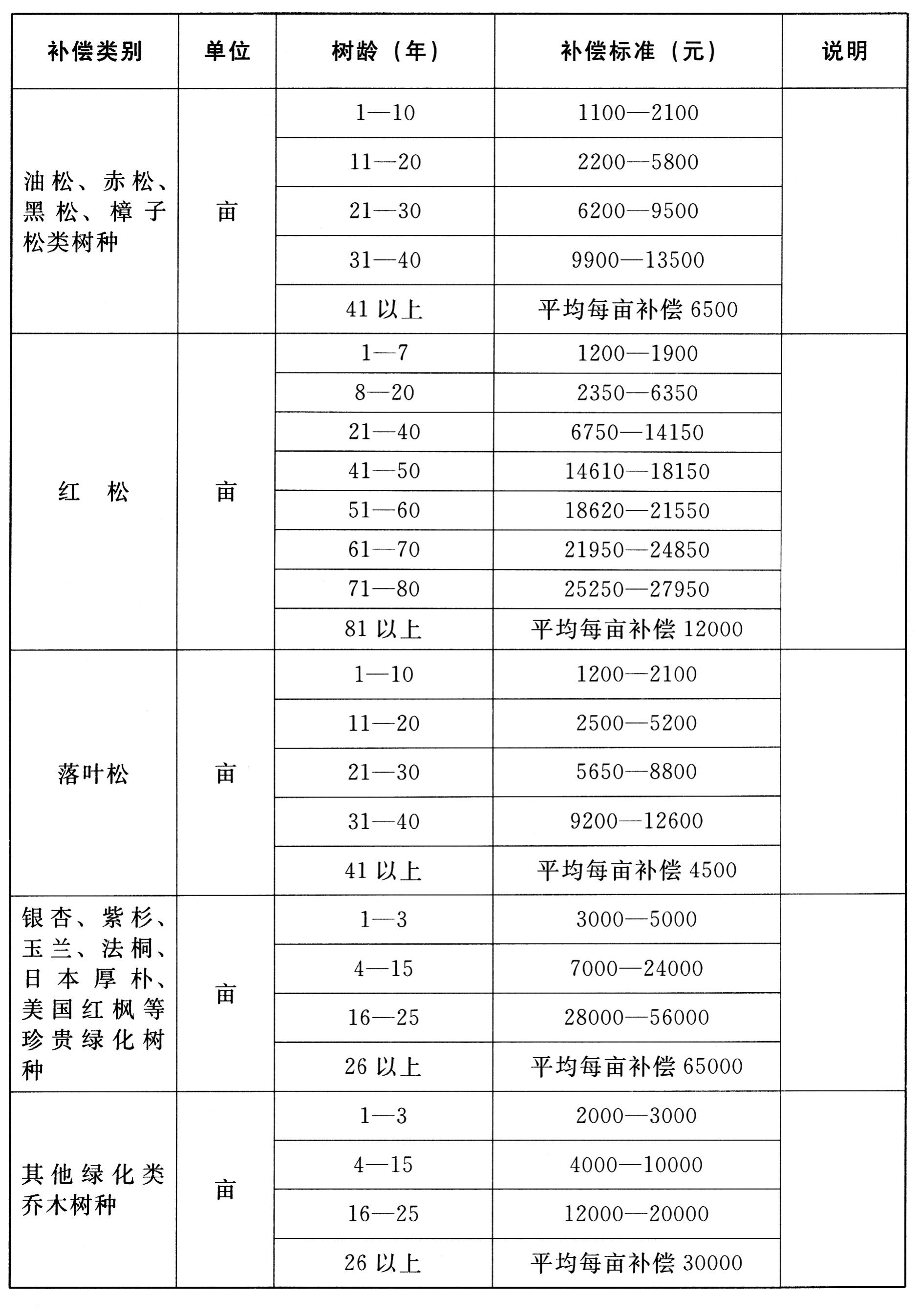 (六)国家保护树种补偿标准。