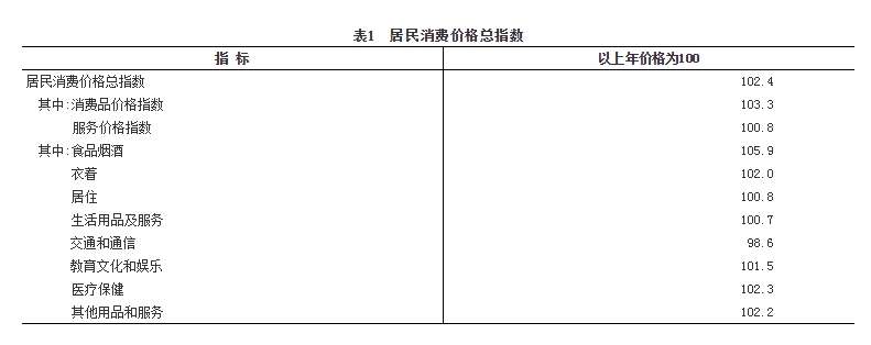 全年居民消费价格比上年上涨2.4%,其中消费品价格上涨3.3%,服务价格上涨0.8%。工业生产者出厂价格比上年下降0.3%。工业生产者购进价格比上年下降0.2%。