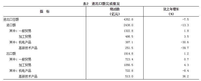 全年进出口总额4352.8亿元,比上年下降7.5%。其中,进口2438亿元,下降13.3%;出口1914.8亿元,增长1.2%。机电产品出口722.8亿元,下降8.4%。一般贸易出口723.4亿元,增长0.7%,占37.8%。民营企业出口690.8亿元,增长4.5%,占36.1%。前六大主要出口市场是日本、韩国、美国、中国台湾、德国、中国香港。