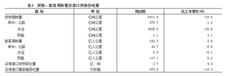全年各种运输方式客货换算周转量5503.4亿吨公里,比上年下降18.3%。其中,货物周转量5411.6亿吨公里,下降18.5%;旅客周转量243.3亿人公里,增长2.6%。