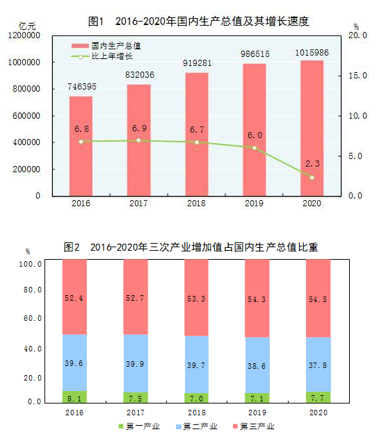 初步核算,全年国内生产总值[3]1015986亿元,比上年增长2.3%。其中,第一产业增加值77754亿元,增长3.0%;第二产业增加值384255亿元,增长2.6%;第三产业增加值553977亿元,增长2.1%。第一产业增加值占国内生产总值比重为7.7%,第二产业增加值比重为37.8%,第三产业增加值比重为54.5%。全年最终消费支出拉动国内生产总值下降0.5个百分点,资本形成总额拉动国内生产总值增长2.2个百分点,货物和服务净出口拉动国内生产总值增长0.7个百分点。分季度看,一季度国内生产总值同比下降6.8%,二季度增长3.2%,三季度增长4.9%,四季度增长6.5%。预计全年人均国内生产总值72447元,比上年增长2.0%。国民总收入[4]1009151亿元,比上年增长1.9%。全国万元国内生产总值能耗[5]比上年下降0.1%。预计全员劳动生产率[6]为117746元/人,比上年提高2.5%。