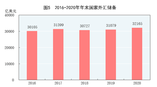 年末国家外汇储备32165亿美元,比上年末增加1086亿美元。全年人民币平均汇率为1美元兑6.8974元人民币,比上年升值0.02%。