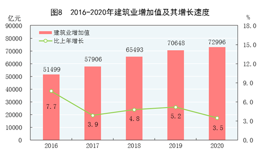全年全社会建筑业增加值72996亿元,比上年增长3.5%。全国具有资质等级的总承包和专业承包建筑业企业利润8303亿元,比上年增长0.3%,其中国有控股企业2871亿元,增长4.7%。