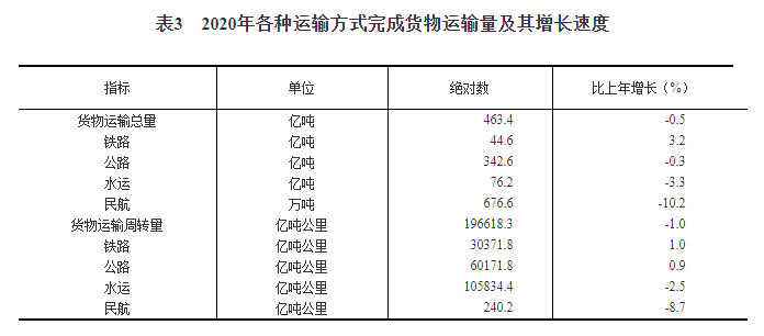 [24]货物运输总量及周转量包括铁路、公路、水路和民航四种运输方式完成量,2020年增速按可比口径计算。因新组建国家管网集团,部分油气运输管线统计归口发生变化等原因,管道运输相关数据尚在核实。