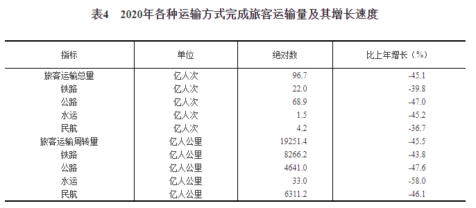 全年旅客运输总量97亿人次,比上年下降45.1%。旅客运输周转量19251亿人公里,下降45.5%。