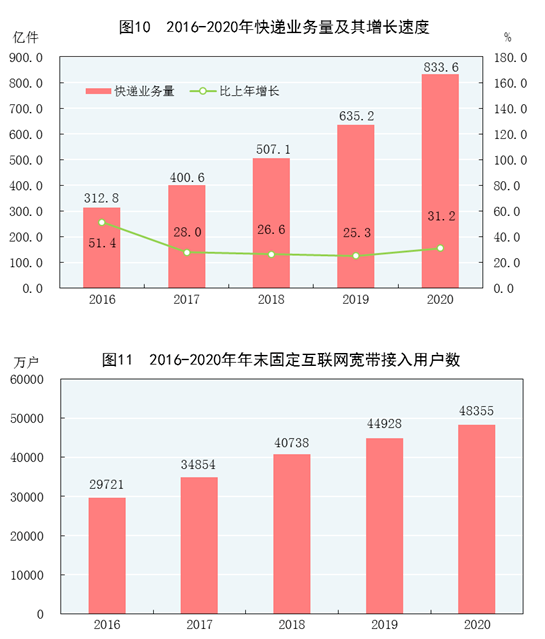 全年完成邮政行业业务总量[25]21053亿元,比上年增长29.7%。邮政业全年完成邮政函件业务14.2亿件,包裹业务0.2亿件,快递业务量833.6亿件,快递业务收入8795亿元。全年完成电信业务总量[26]136758亿元,比上年增长28.1%。年末全国电话用户总数177598万户,其中移动电话用户159407万户。移动电话普及率为113.9部/百人。固定互联网宽带接入用户[27]48355万户,比上年末增加3427万户,其中固定互联网光纤宽带接入用户[28]45414万户,增加3675万户。全年移动互联网用户接入流量1656亿GB,比上年增长35.7%。年末互联网上网人数9.89亿人,其中手机上网人数[29]9.86亿人。互联网普及率为70.4%,其中农村地区互联网普及率为55.9%。全年软件和信息技术服务业[30]完成软件业务收入81616亿元,按可比口径计算,比上年增长13.3%。