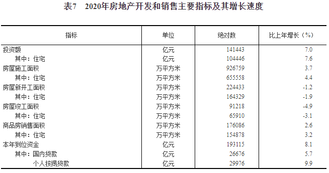 全年房地产开发投资141443亿元,比上年增长7.0%。其中住宅投资104446亿元,增长7.6%;办公楼投资6494亿元,增长5.4%;商业营业用房投资13076亿元,下降1.1%。年末商品房待售面积49850万平方米,比上年末增加29万平方米。其中,商品住宅待售面积22379万平方米,减少94万平方米。