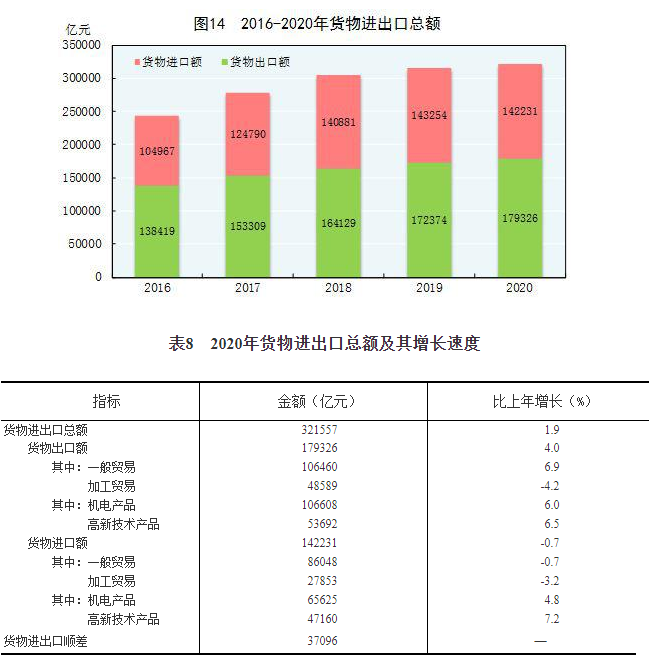 全年货物进出口总额321557亿元,比上年增长1.9%。其中,出口179326亿元,增长4.0%;进口142231亿元,下降0.7%。货物进出口顺差37096亿元,比上年增加7976亿元。对“一带一路”[38]沿线国家进出口总额93696亿元,比上年增长1.0%。其中,出口54263亿元,增长3.2%;进口39433亿元,下降1.8%。
