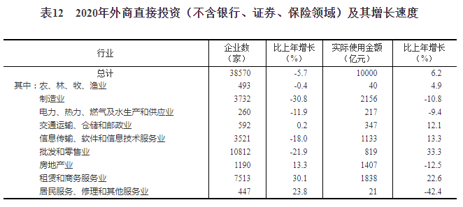全年外商直接投资(不含银行、证券、保险领域)新设立企业38570家,比上年下降5.7%。实际使用外商直接投资金额10000亿元,增长6.2%,折1444亿美元,增长4.5%。其中“一带一路”沿线国家对华直接投资(含通过部分自由港对华投资)新设立企业4294家,下降23.2%;对华直接投资金额574亿元,下降0.3%,折83亿美元,下降1.8%。全年高技术产业实际使用外资2963亿元,增长11.4%,折428亿美元,增长9.5%。