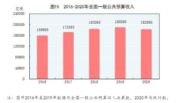 全年全国一般公共预算收入182895亿元,比上年下降3.9%。其中税收收入154310亿元,下降2.3%。全国一般公共预算支出245588亿元,比上年增长2.8%。全年新增减税降费超过2.5万亿元。