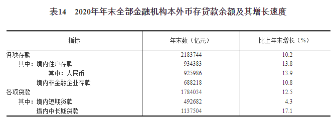 全年社会融资规模增量[40]34.9万亿元,按可比口径计算,比上年多9.2万亿元;年末社会融资规模存量[41]284.8万亿元,按可比口径计算,比上年末增长13.3%,其中对实体经济发放的人民币贷款余额171.6万亿元,增长13.2%。年末全部金融机构本外币各项存款余额218.4万亿元,比年初增加20.2万亿元,其中人民币各项存款余额212.6万亿元,增加19.6万亿元。全部金融机构本外币各项贷款余额178.4万亿元,增加19.8万亿元,其中人民币各项贷款余额172.7万亿元,增加19.6万亿元。人民币普惠金融贷款[42]余额21.5万亿元,增加4.2万亿元。