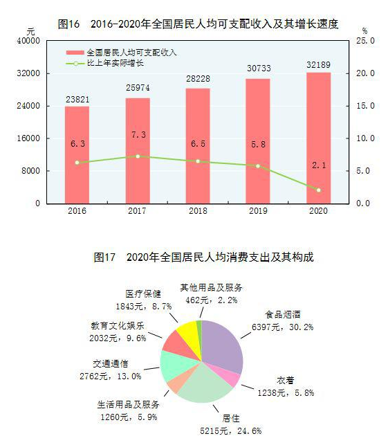 全年全国居民人均可支配收入32189元,比上年增长4.7%,扣除价格因素,实际增长2.1%。全国居民人均可支配收入中位数[47]27540元,增长3.8%。按常住地分,城镇居民人均可支配收入43834元,比上年增长3.5%,扣除价格因素,实际增长1.2%。城镇居民人均可支配收入中位数40378元,增长2.9%。农村居民人均可支配收入17131元,比上年增长6.9%,扣除价格因素,实际增长3.8%。农村居民人均可支配收入中位数15204元,增长5.7%。城乡居民人均可支配收入比值为2.56,比上年缩小0.08。按全国居民五等份收入分组[48],低收入组人均可支配收入7869元,中间偏下收入组人均可支配收入16443元,中间收入组人均可支配收入26249元,中间偏上收入组人均可支配收入41172元,高收入组人均可支配收入80294元。全国农民工人均月收入4072元,比上年增长2.8%。