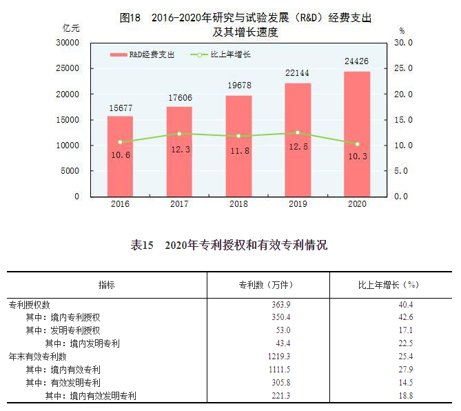 全年研究与试验发展(R&D)经费支出24426亿元,比上年增长10.3%,与国内生产总值之比为2.40%,其中基础研究经费1504亿元。国家科技重大专项共安排198个项目(课题),国家自然科学基金共资助4.57万个项目。截至年末,正在运行的国家重点实验室522个,国家工程研究中心(国家工程实验室)350个,国家企业技术中心1636家,大众创业万众创新示范基地212家。国家级科技企业孵化器[54]1173家,国家备案众创空间[55]2386家。全年授予专利权363.9万件,比上年增长40.4%;PCT专利申请受理量[56]7.2万件。截至年末,有效专利1219.3万件,其中境内有效发明专利221.3万件,预计每万人口发明专利拥有量15.8件。全年商标注册576.1万件,比上年下降10.1%。全年共签订技术合同55万项,技术合同成交金额28252亿元,比上年增长26.1%。