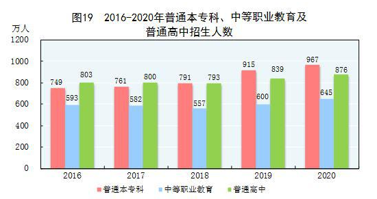 全年研究生教育招生110.7万人,在学研究生314.0万人,毕业生72.9万人。普通本专科招生967.5万人,在校生3285.3万人,毕业生797.2万人。中等职业教育[58]招生644.7万人,在校生1663.4万人,毕业生484.9万人。普通高中招生876.4万人,在校生2494.5万人,毕业生786.5万人。初中招生1632.1万人,在校生4914.1万人,毕业生1535.3万人。普通小学招生1808.1万人,在校生10725.4万人,毕业生1640.3万人。特殊教育招生14.9万人,在校生88.1万人,毕业生12.1万人。学前教育在园幼儿4818.3万人。九年义务教育巩固率为95.2%,高中阶段毛入学率为91.2%。