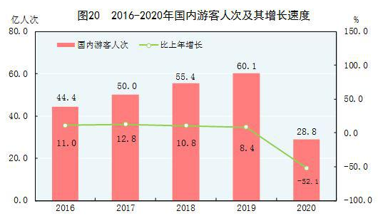 全年国内游客28.8亿人次,比上年下降52.1%。其中,城镇居民游客20.7亿人次,下降53.8%;农村居民游客8.1亿人次,下降47.0%。国内旅游收入22286亿元,下降61.1%。其中,城镇居民游客花费17967亿元,下降62.2%;农村居民游客花费4320亿元,下降55.7%。