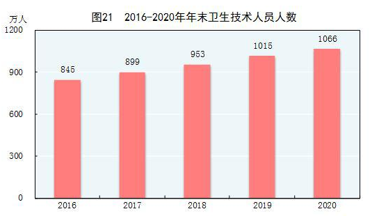 年末全国共有医疗卫生机构102.3万个,其中医院3.5万个,在医院中有公立医院1.2万个,民营医院2.4万个;基层医疗卫生机构97.1万个,其中乡镇卫生院3.6万个,社区卫生服务中心(站)3.5万个,门诊部(所)29.0万个,村卫生室61.0万个;专业公共卫生机构1.4万个,其中疾病预防控制中心3384个,卫生监督所(中心)2736个。年末卫生技术人员1066万人,其中执业医师和执业助理医师408万人,注册护士471万人。医疗卫生机构床位911万张,其中医院713万张,乡镇卫生院139万张。全年总诊疗人次[62]78.2亿人次,出院人数[63]2.3亿人。截至年末,全国累计报告新型冠状病毒肺炎确诊病例87071例,累计治愈出院病例82067例,累计死亡4634人。全国共有8177家医疗卫生机构提供新型冠状病毒核酸检测服务,总检测能力达到1153万份/天。