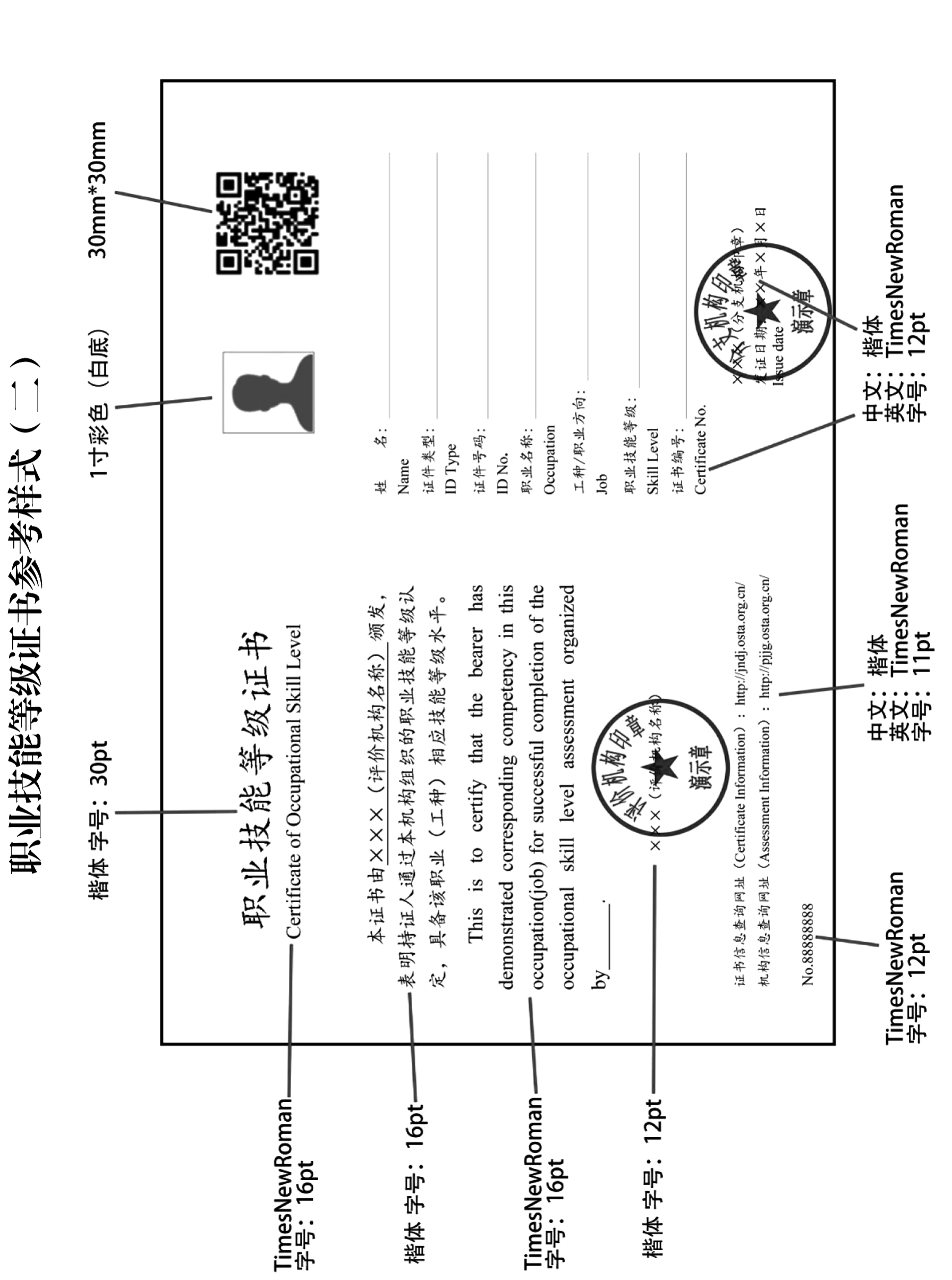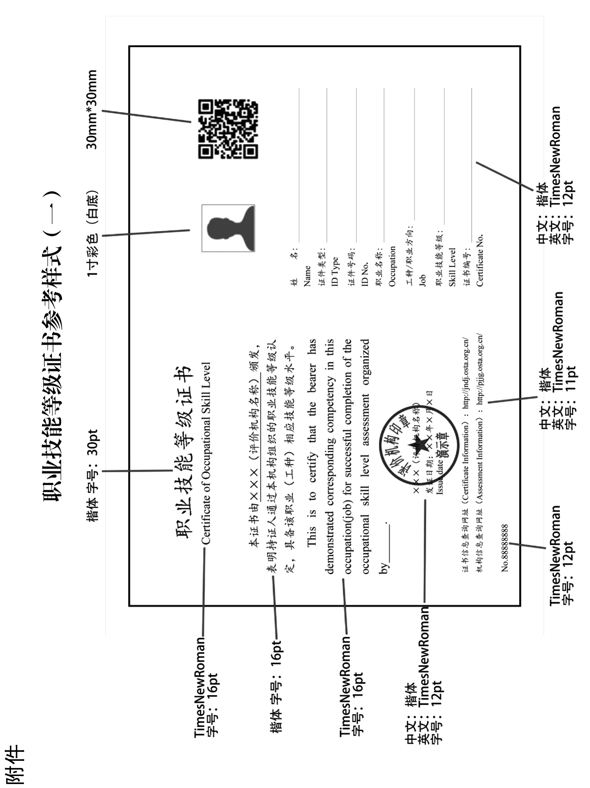 (一)证书应包括以下内容:证书名称、证书正文、评价机构名称、发证日期、姓名、证件类型、证件号码、职业名称、工种/职业方向、职业技能等级、证书编号,以及持证人照片、二维码、证书信息查询网址(http://jndj.osta.org.cn)、机构信息查询网址(http://pjjg.osta.org.cn)。评价机构可根据实际情况在证书上增加省(自治区、直辖市)人力资源社会保障部门证书查询网址和证书印制流水码。