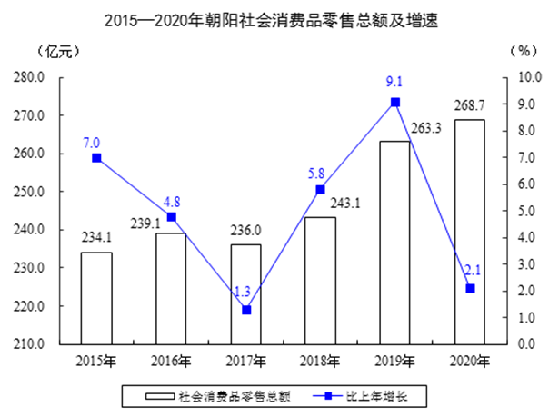 全年社会消费品零售总额268.7亿元,比上年增长2.1%。从地域看:城镇消费品零售额237.1亿元,增长1.7%;乡村消费品零售额31.6亿元,增长4.5%。从消费形态看:商品零售实现242.8亿元,增长2.4%;餐饮收入实现26亿元,下降1%。从行业看:批发零售业零售额242.4亿元,增长2.4%,其中限额以上零售额74.9亿元,增长1.4%;住宿餐饮业零售额26.4亿元,下降0.9%,其中限额以上零售额3.2亿元,增长6.2%。