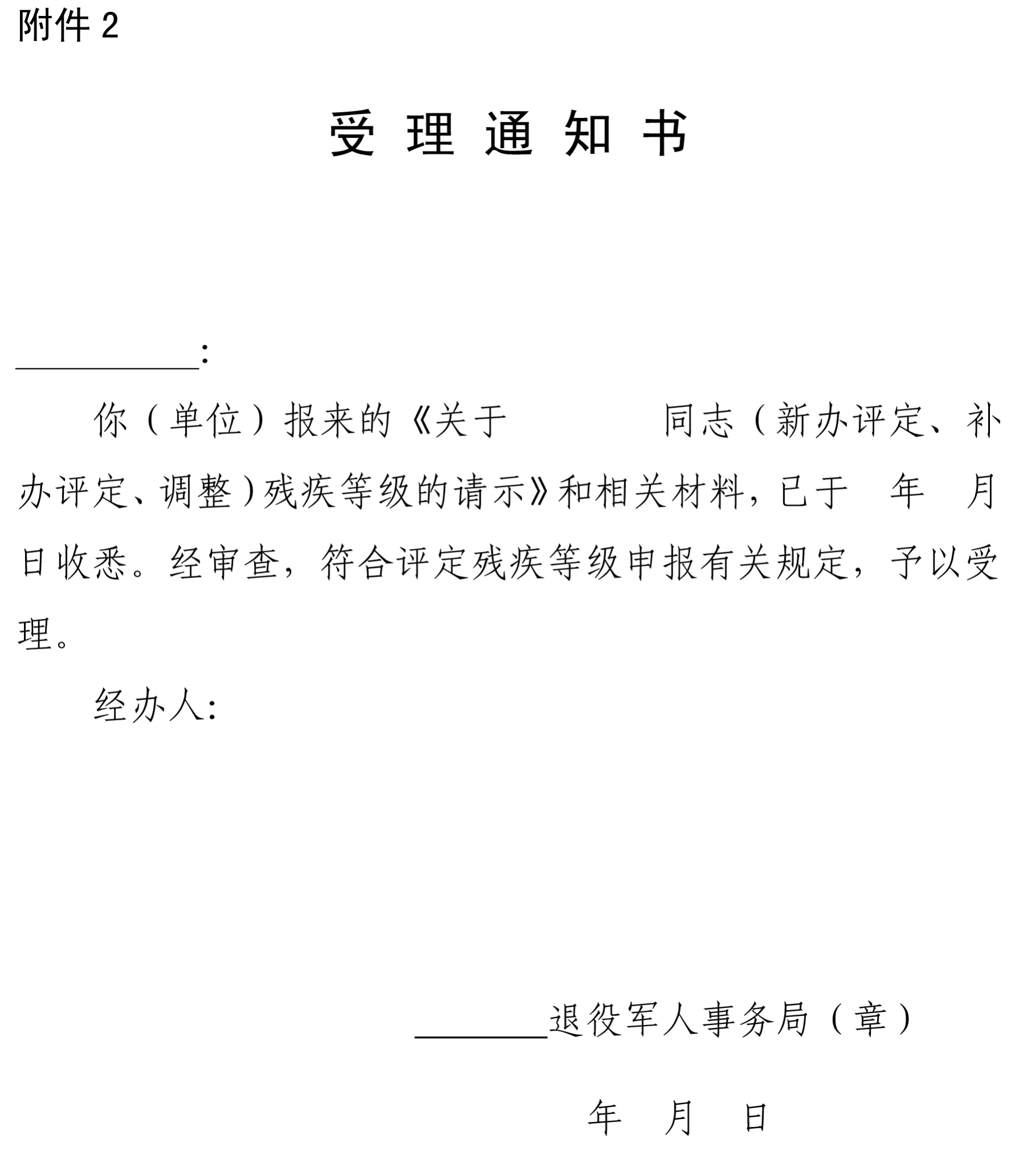 第十八条 申请人的评残申报材料经县、市、省退役军人事务厅审核同意后,由县级退役军人事务部门在20个工作日内签发《受理通知书》,并告知第十四条规定人员到市级退役军人事务部门指定的医疗评定机构进行残疾等级医学鉴定;告知第十五条规定人员到省退役军人事务厅指定的医疗评定机构进行残疾等级医学鉴定。