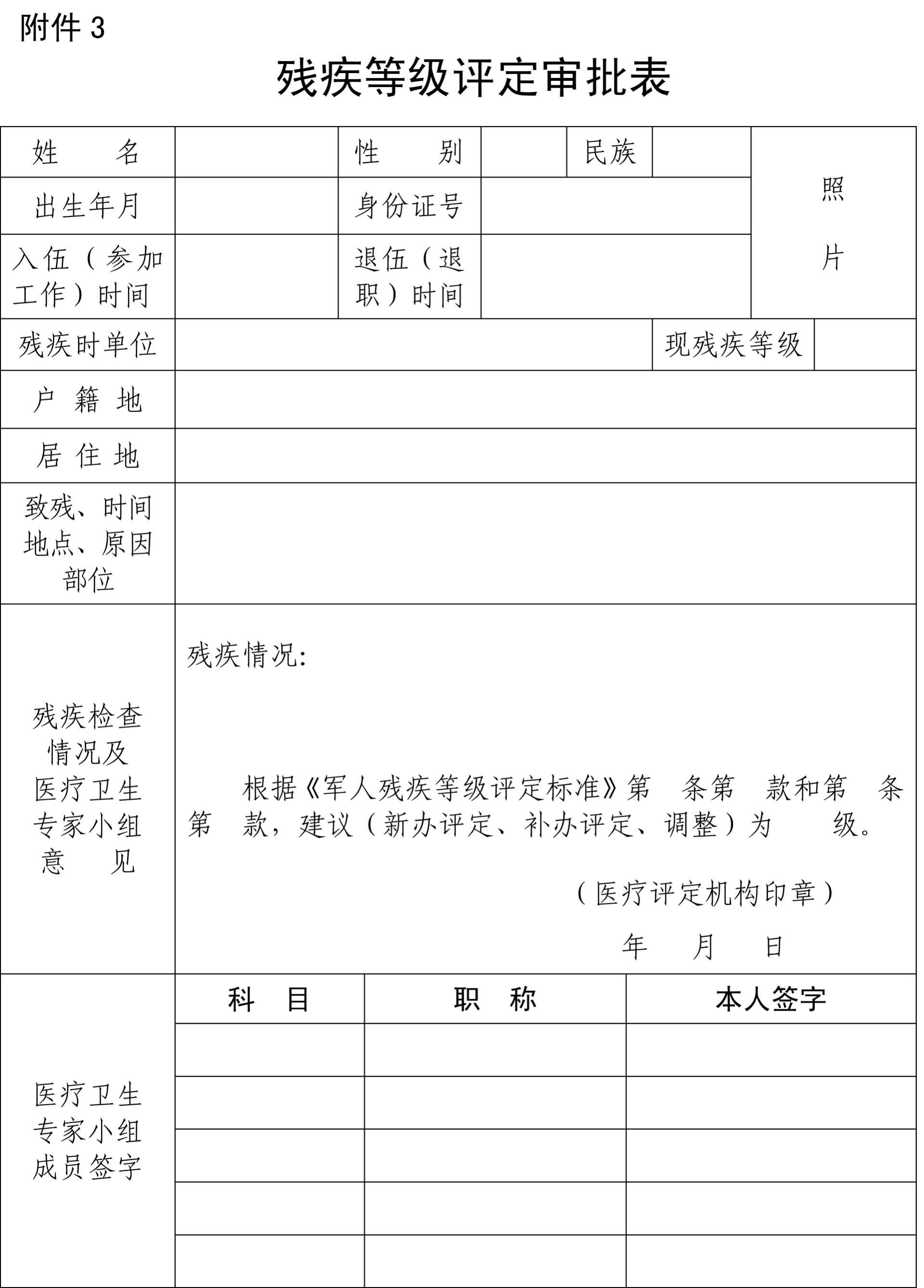 第十六条 医疗卫生专家小组根据《军人残疾等级评定标准》,对申请人残疾情况进行医学鉴定,拟定残疾等级,在《残疾等级评定审批表》上签署意见、加盖印章。医疗卫生专家小组成员(3人及以上单数)在《残疾等级评定审批表》上签字确认。