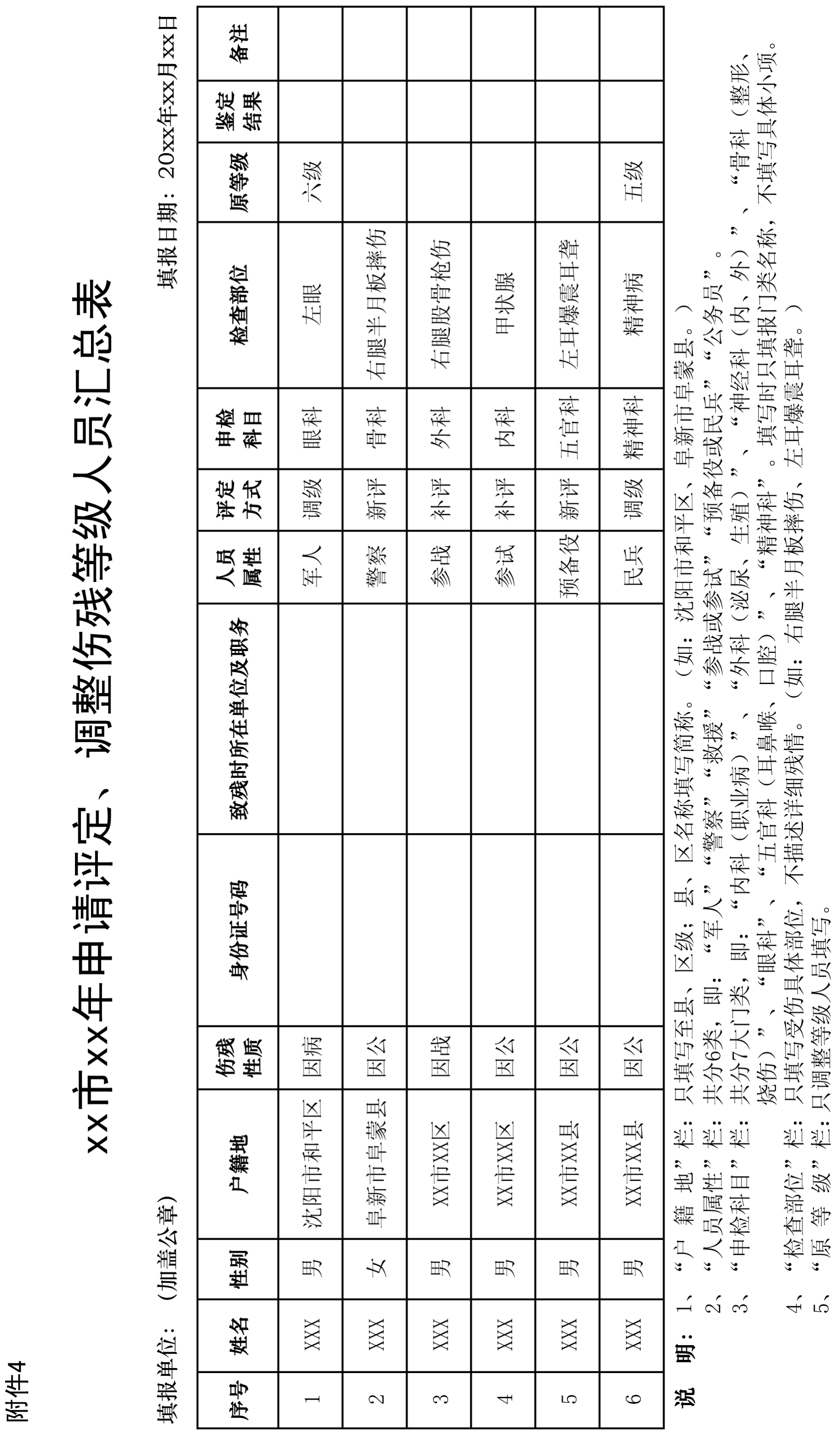 4.《XX市XX年评定、调整伤残等级人员汇总表》