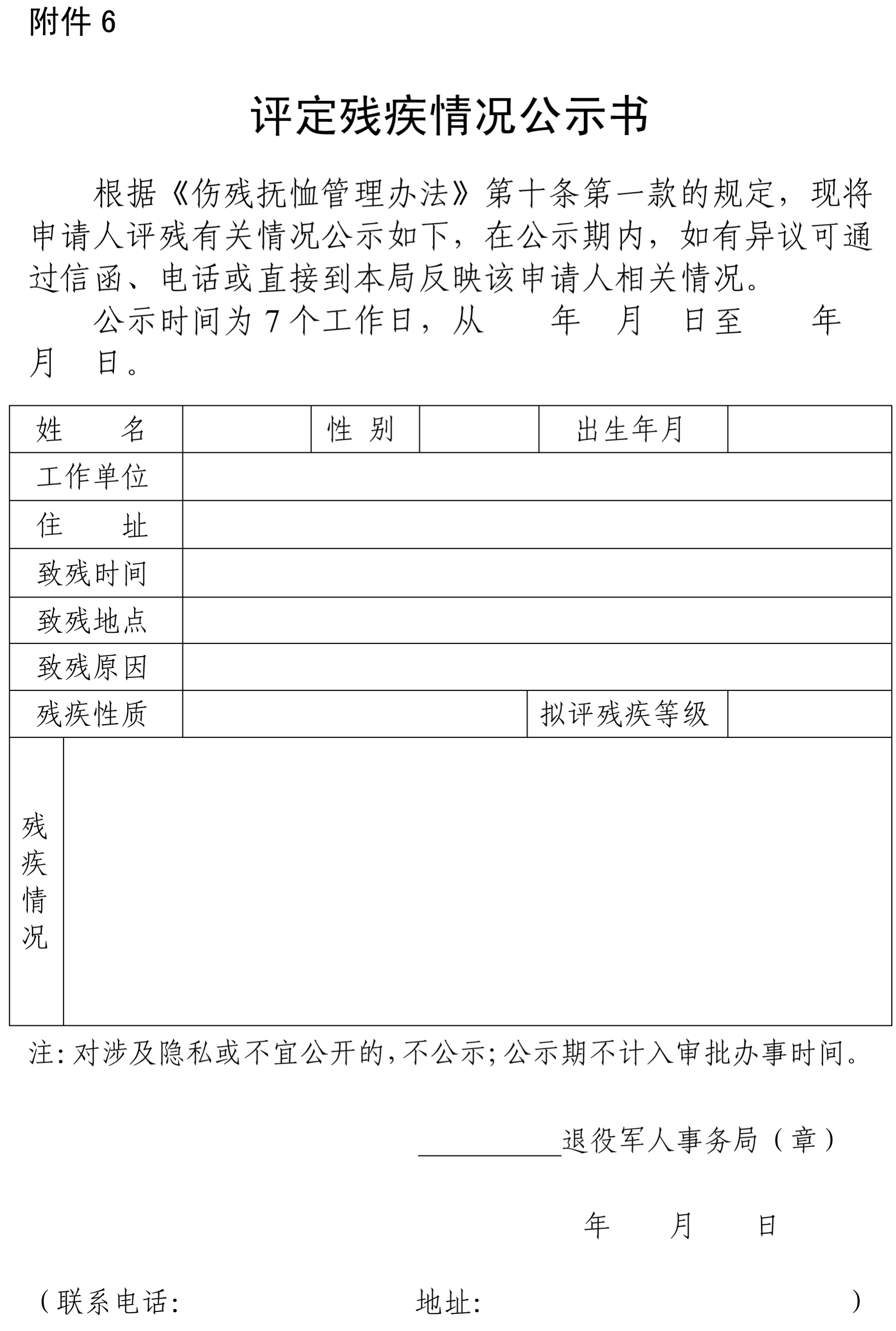 5.为抢救和保护国家财产、人民生命财产致残的人员,须有申请人受县级以上人民政府或者相关部门出具的有关申请人负伤时间、地点、负伤部位、详细经过的证明材料或表彰决定;