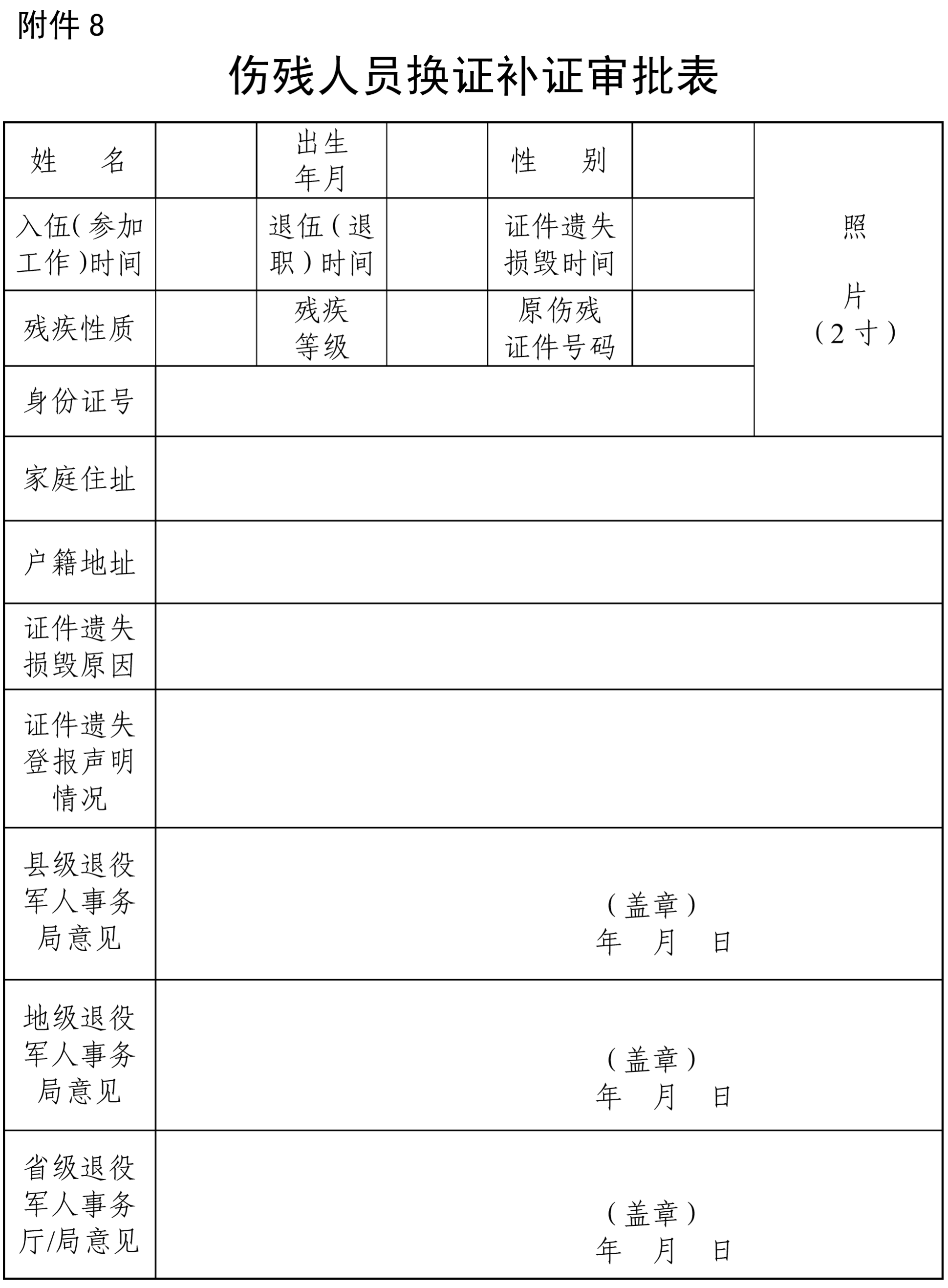 县级退役军人事务部门经审查认为符合条件的,填写《伤残人员换证补证审批表》,连同申报材料逐级上报省退役军人事务厅。省退役军人事务厅将新办理的伤残证件逐级通过县级退役军人事务部门发给申请人。