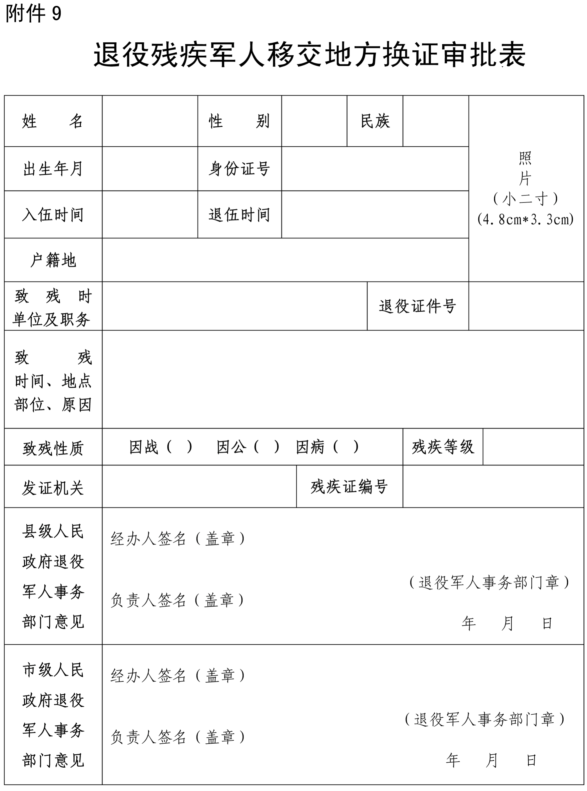 省退役军人事务厅核实无误的,在《退役残疾军人移交地方换证审批表》上签署意见,加盖印章;在《残疾军人证》变更栏内填写新的户籍地、重新编号,加盖印章,逐级通过县级退役军人事务部门将《残疾军人证》发还申请人,《退役残疾军人移交地方换证审批表》存入个人伤残档案。