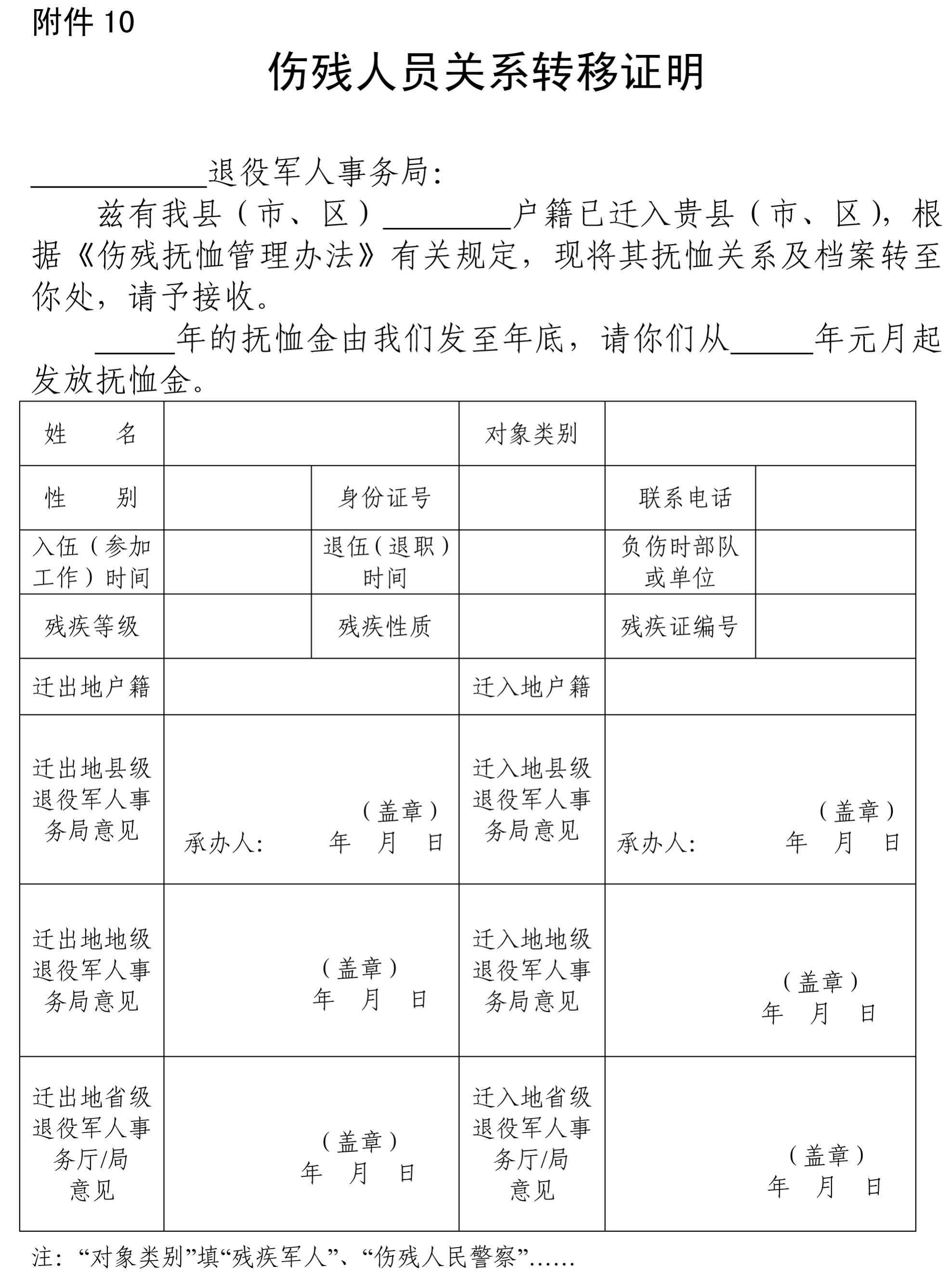第三十六条 伤残人员跨省迁移户籍时,应同步转移伤残抚恤关系。迁出地的县级退役军人事务部门根据伤残人员申请及其伤残证件和迁入地户口簿,将伤残档案、迁入地户口簿复印件以及《伤残人员关系转移证明》,发送迁入地县级退役军人事务部门,并同时将此信息逐级上报本省退役军人事务厅。