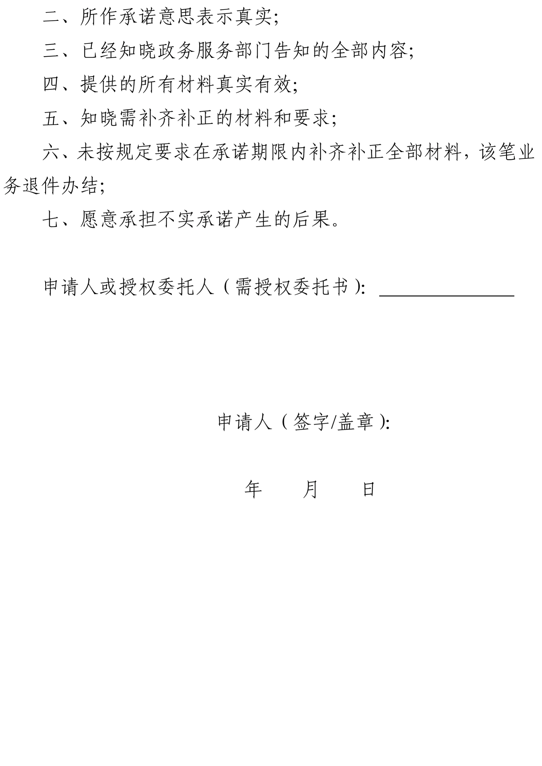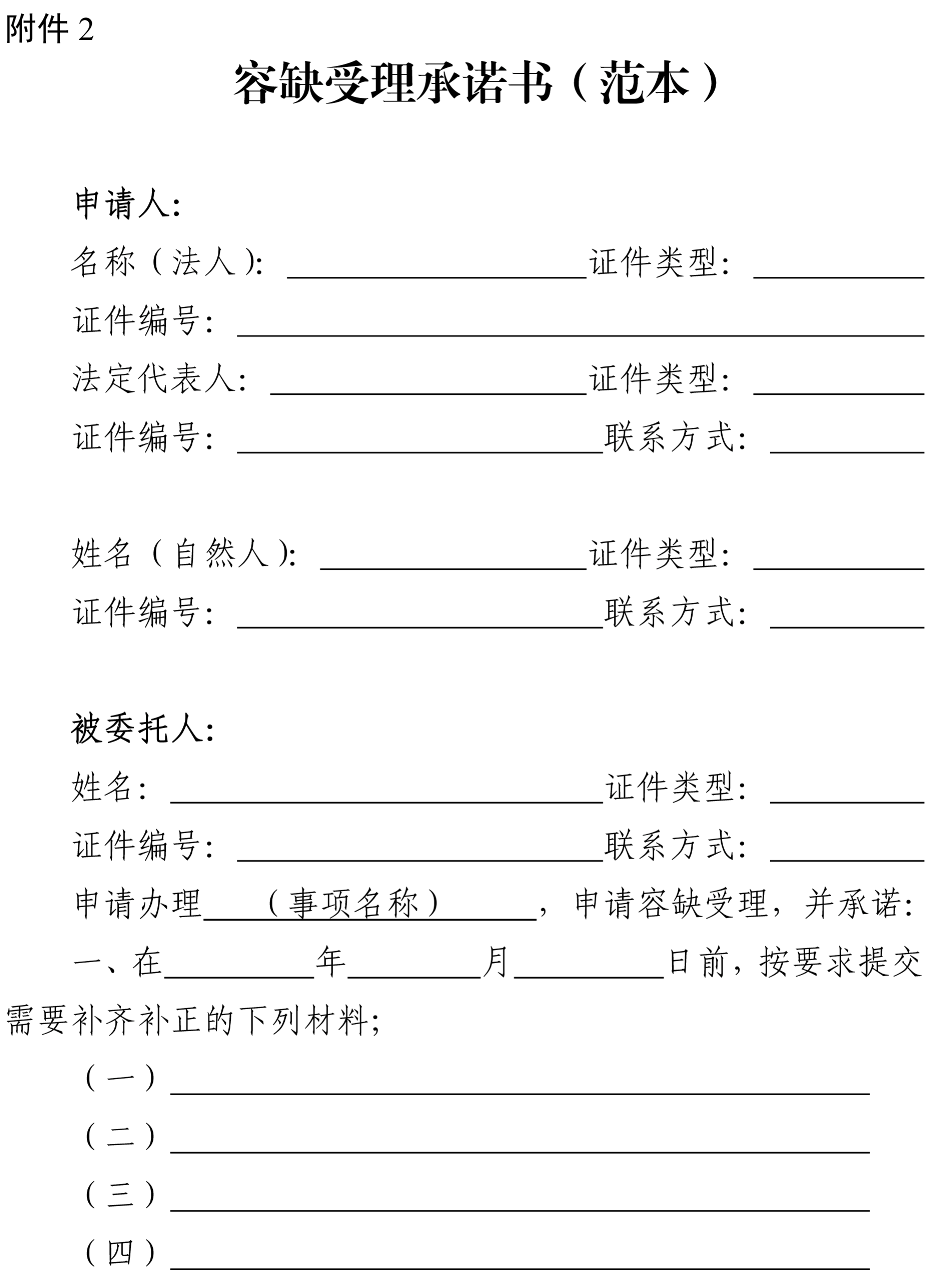 第九条 申请人申请容缺受理的,应当签署《容缺受理承诺书》。以个人名义申请的,承诺书须本人签名(含电子签名)。以法人或其他组织名义申请的,承诺书应当由法定代表人(负责人)或由被委托人签名并加盖公章(含电子印章)。委托办理容缺受理业务的,被委托人应当提交明确授权。