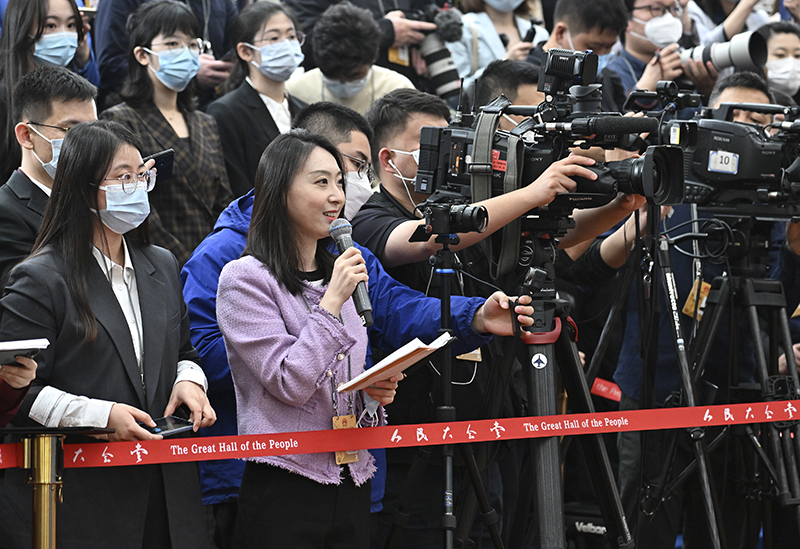 3月5日,第十四届全国人民代表大会第一次会议举行首场“部长通道”采访活动。这是新华社记者在采访。