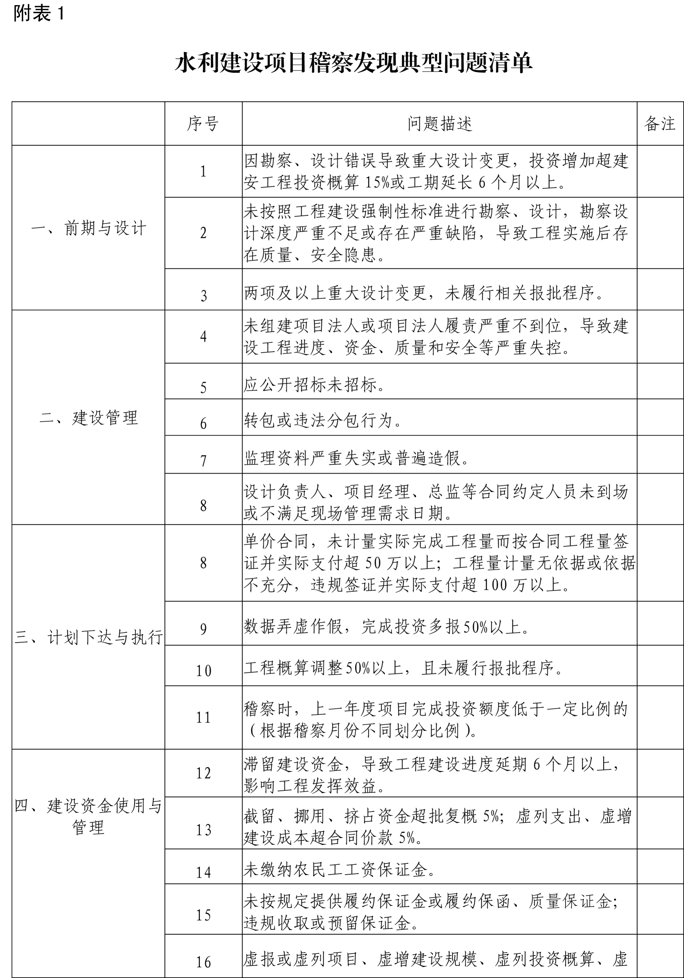 水利建设项目稽察发现典型问题通报标准