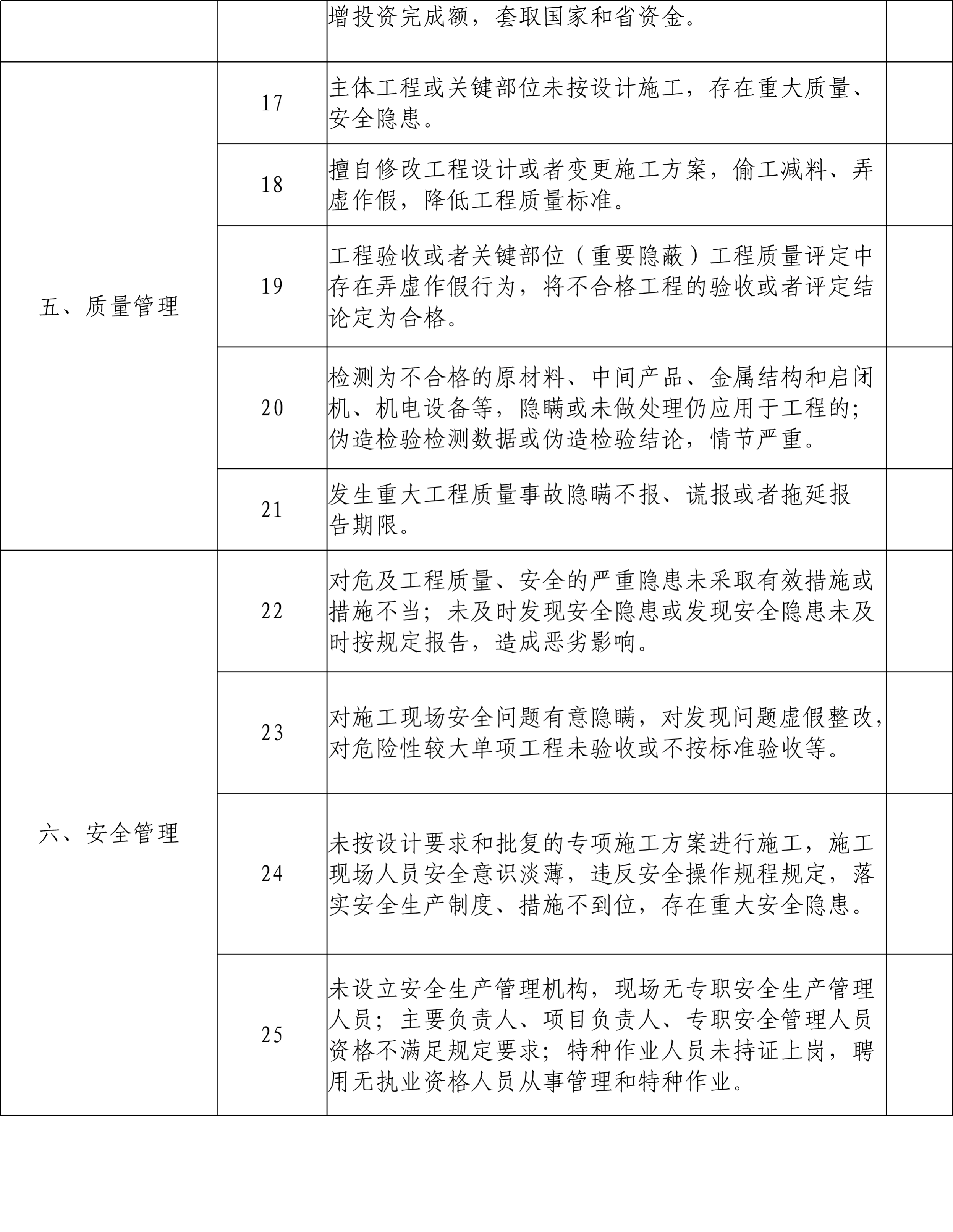 第二十一条 工程质量与安全稽察,包括检查工程质量现状,参建单位质量与安全责任体系,制度建设与执行,质量控制和检验评定,工程验收,安全技术措施和专项施工方案,施工安全管理,安全隐患排查与治理,工程安全度汛等情况。