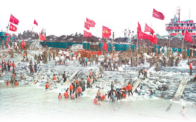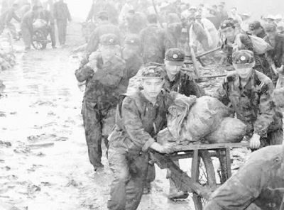 | 1998年7月,为确保荆江大堤的安全,数千名解放军官兵以惊人的毅力坚守在大堤上,排除决堤险情。图为战士们运送袋装沙石加固大堤。 |