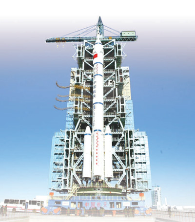 | 2002年12月,神舟四号船箭塔组合体转运到发射塔架上。 |