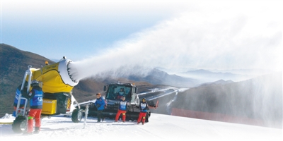 | 2022年冬奥会崇礼赛区,工作人员在进行人工造雪。 |