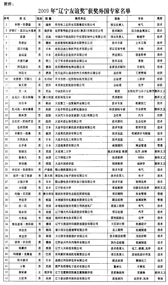 附件:2009年“辽宁友谊奖”获奖外国专家名单
