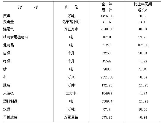 粮食作物播种面积增加,粮食产量创历史新高。随着农村税费改革的不断深入和各种惠农政策的落实,以及市场价格导向作用,极大地激发了广大农民种粮食积极性,粮食播种面积明显上升。全年粮食作物播种面积30.3万公顷(455.2万亩),增长10.2%;油料播种面积4.6万公顷(68.7万亩),下降13.4%;蔬菜播种面积1.5万公顷(22.3万亩),下降40.7%。全年粮食产量187.0万吨,比上年增产29.0万吨,增长18.3%,创历史新高。其中水稻产量3.7万吨,增长15.4%;玉米产量143.4万吨,增长14.9%;高粱产量21.5万吨,增长65.1%;大豆产量5.2万吨,下降7.8%。经济作物中,油料产量9.5万吨,下降6.8%;烟叶产量0.5万吨,增长97.0%;蔬菜产量56.9万吨,下降38.9%;水果产量3.1万吨,与上年基本持平。