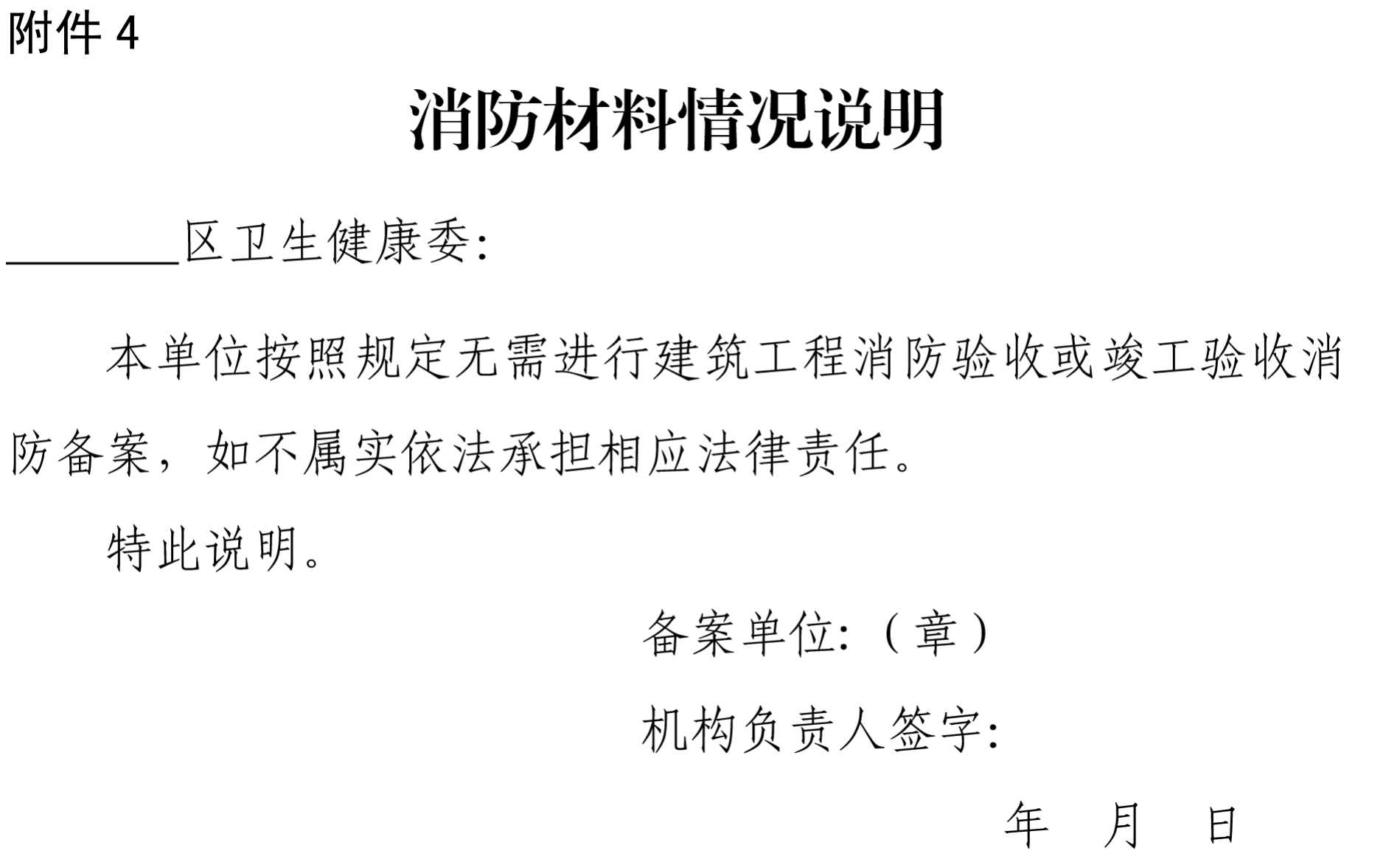 (五)消防安全检查合格证明。按照规定应当进行消防验收、备案的托育机构,需提供消防验收意见书或消防备案凭证;按照规定无需进行消防验收、备案的托育机构,需提供情况说明(附件4)。